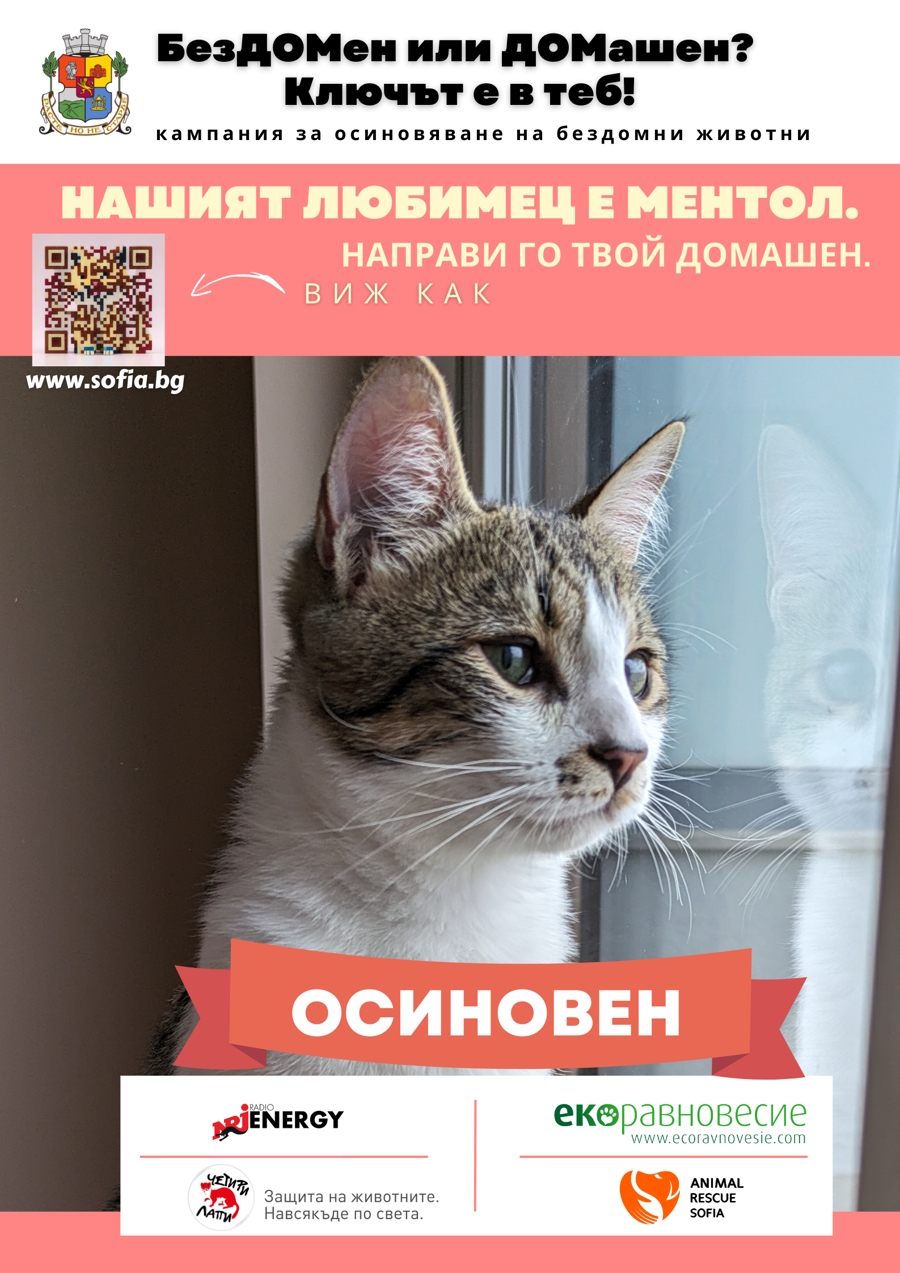 Историята на младия писан все още се пише и той много се надява, че му предстоят само хубави неща. Това коте е толкова свежо, че на практика е ментово. Той е смел и посреща всяка ситуация с любопитство и игривост. Ментол има всички ваксини, чип, паспорт и разбира се – знае как да ползва тоалетната.