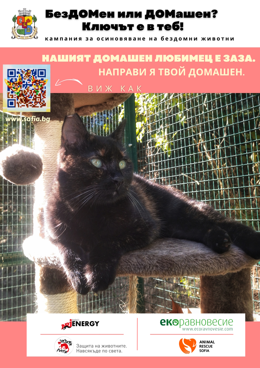 Заза търси дом, в който да внесе щастие и оживление. Сладураната обича да изследва наоколо и да се включва във всичко, което се случва. Любимите ѝ занимания са игрите и гушкането, а когато е спокойно - да наблюдава през прозореца. Заза обича да има компания и мило кани всеки, който е наблизо, да се присъедини към нейните занимания. Освен хора, се разбира и с други котки. Заза е ваксинирана, чипирана и обезпаразитена.