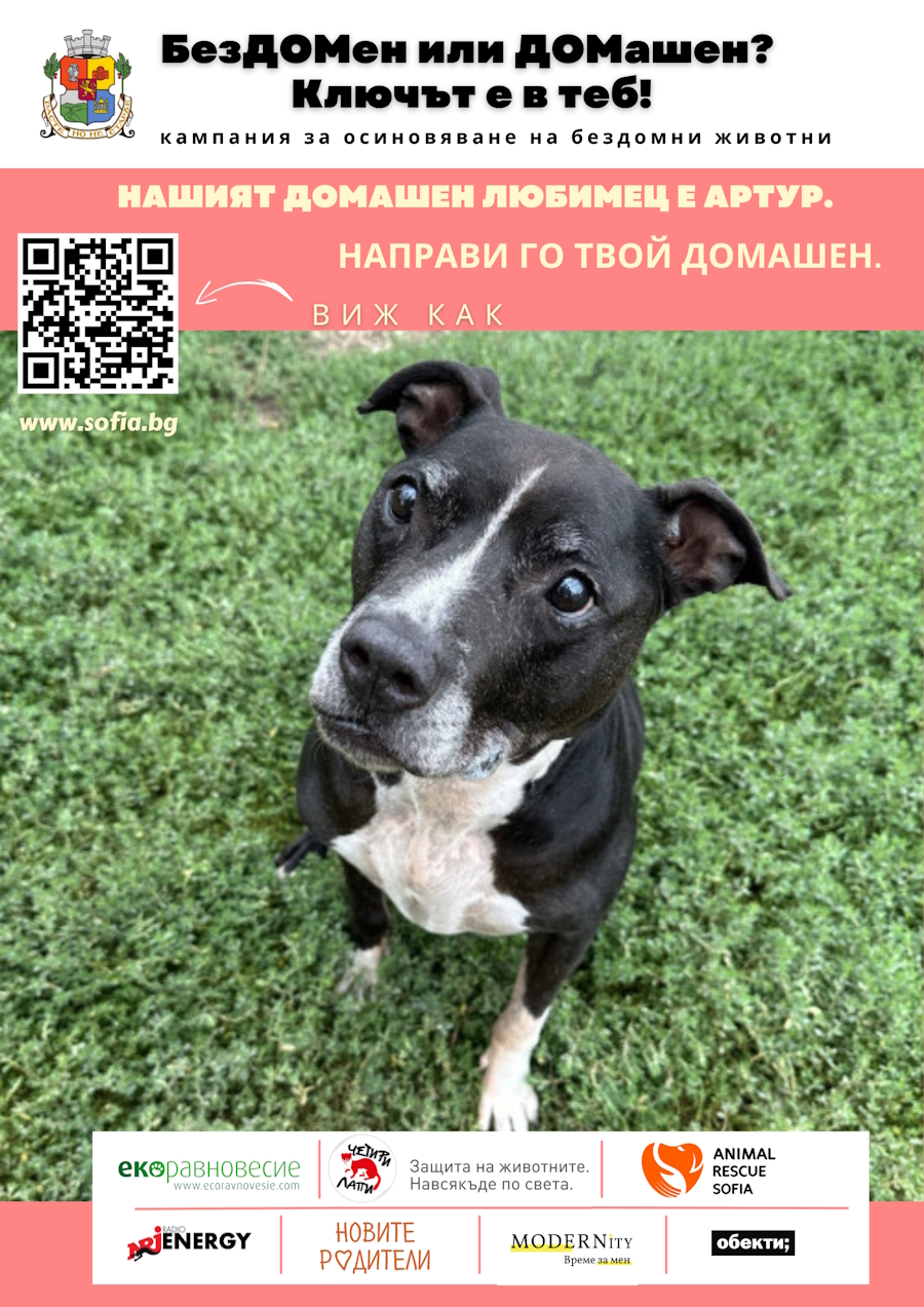 Артур е едно от любимите попълнения питбули в приюта в "Горни Богров". Намира се там от 2020 г. Артур е около 9-годишен, средeн (към голям) по размер, черно-бял на цвят. Изключително нежен и внимателен. Много енергичен за възрастта си. Знае основни команди и ходи добре на повод. Научен е от доброволци да дава лапа. Не е показвал агресия към себеподобни или към хора. Не се впечатлява от играчки. Контролира се лесно. Той е кастриран, чипиран, ваксиниран и има европаспорт, така че чака с нетърпение своите осиновители! За съжаление т.г. (2024-та) Артур два пъти излиза от приюта поради здравословни проблеми и паднала имунна система, студът не му понася добре, ако трябва да живее навън. Но момчето вече е добре, а при запознанство доброволците от „Осинови питбул“ ще ви разкажат за неговите нужди, които в никакъв случай не са ангажиращи. За него е подходящ опитен човек. Ако искаш да се запознаеш с Артур - пиши или ела на разходките всяка събота от 10 до 14 или се свържи с доброволците от „Осинови питбул“ за съдействие! Те ще ти разкажат подробно за него и нуждите му и ще съдействат да се запознаете! Дайте шанс на Артур да изживее старините си достойно и да донесе много радост и любов във вашия дом. Твой Артур, приют "Горни Богров".