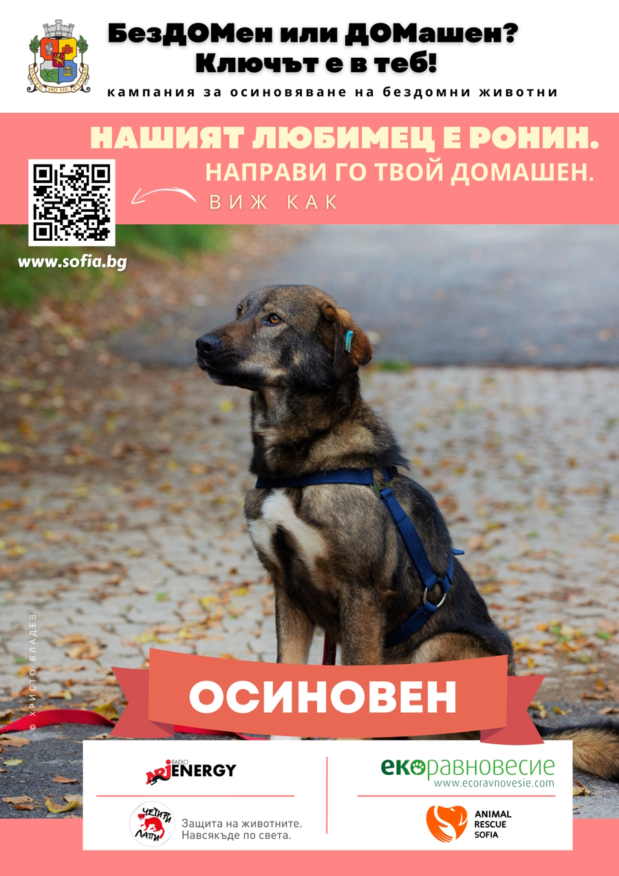 Сега, когато най-после се оправи, куче Ронин няма търпение да поеме по своя нов светъл път и да срещне своите бъдещи стопани. Кучето е ваксинирано, чипирано и кастрирано. Ронин има изградени хигиенни навици и редовно е обезпаразитяван. Разбира се с други кучета и много обича да играе на гоненица. Обожава човешкото внимание и всички човеци – малки и пораснали.