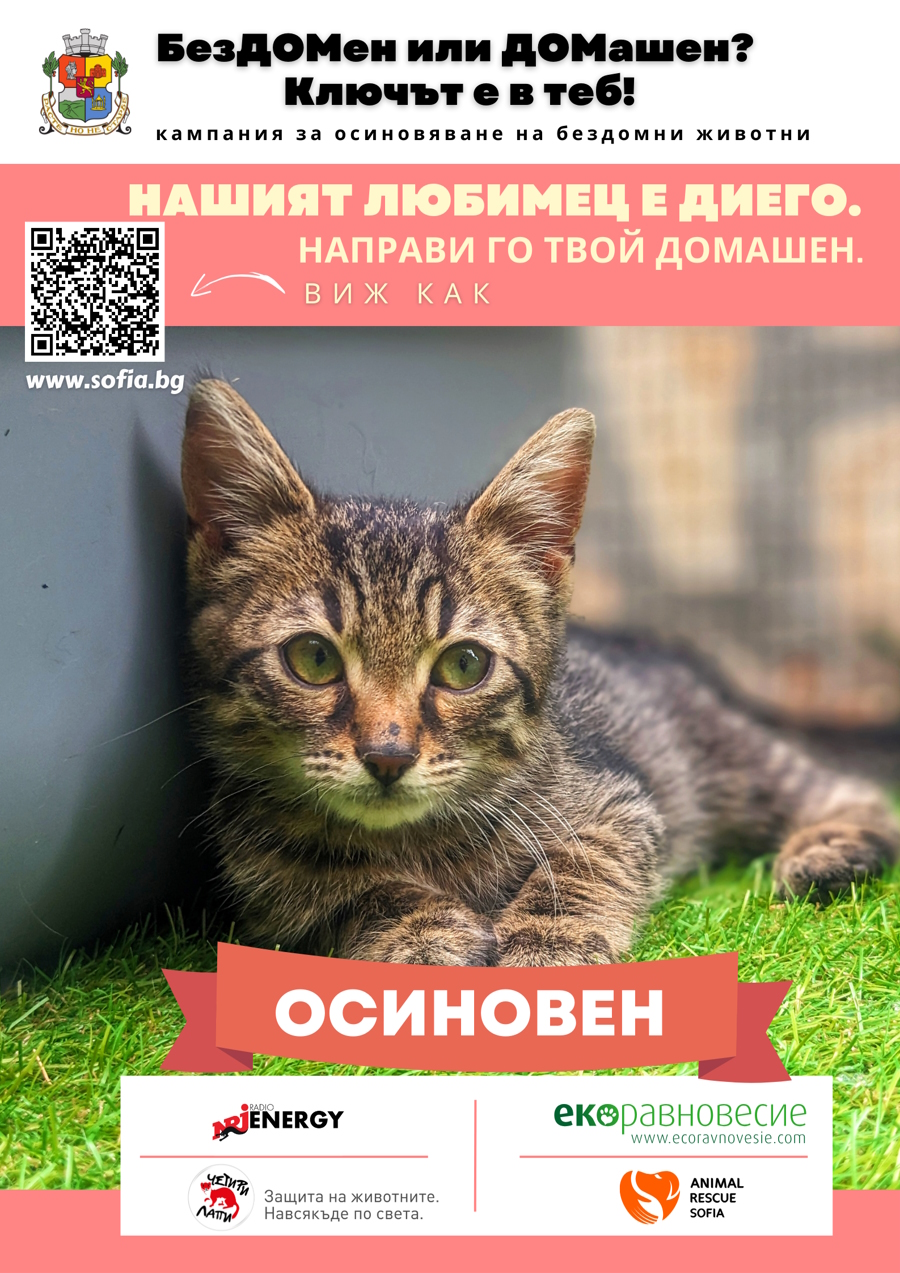 Диего е чудесно младо коте и вече е напълно здрав. Той е ваксиниран, чипиран и обезпаразитен. Само чака дом, в който да бъде гален, обичан и да си играят с него. Надяваме се по-скоро да намери своето място под слънцето.