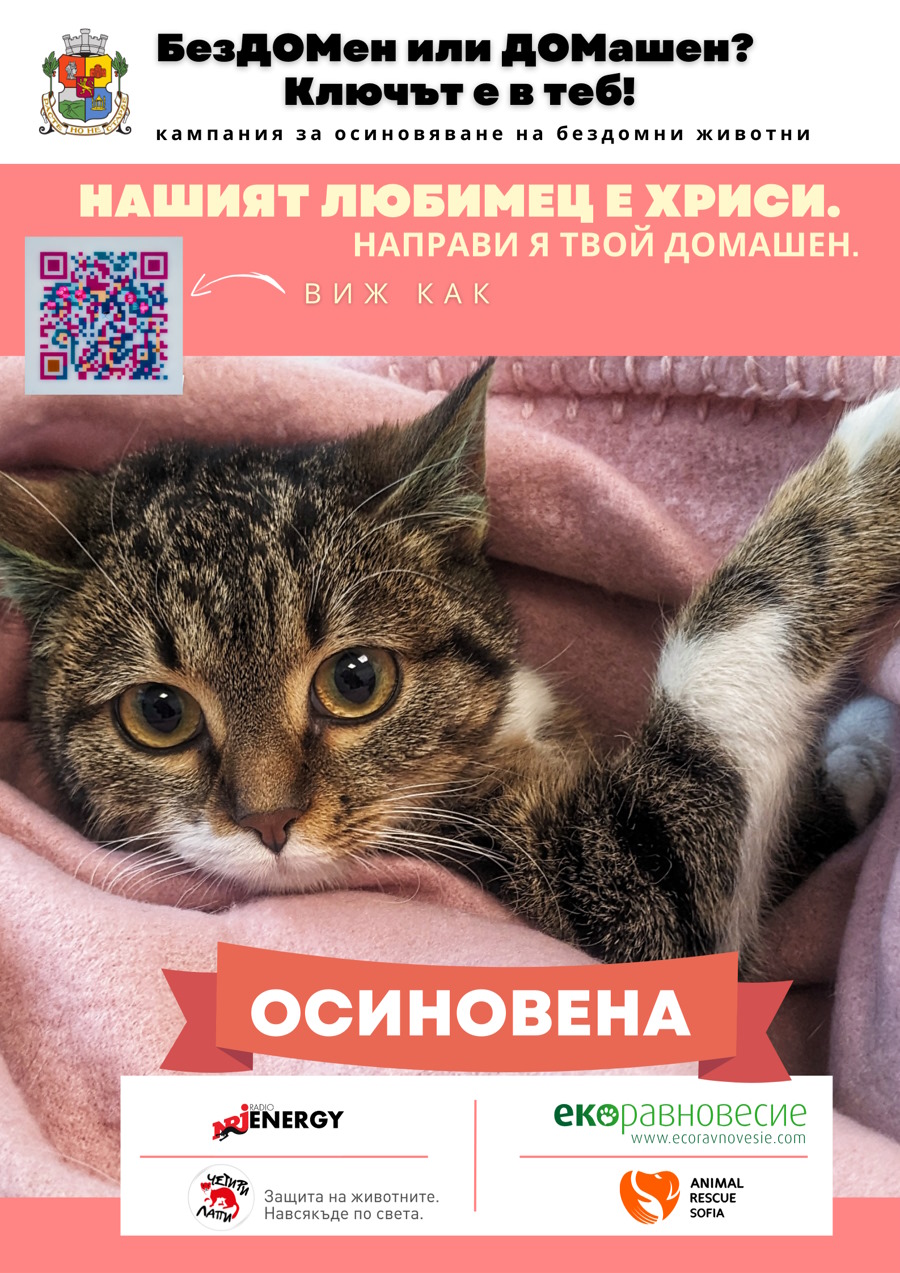 Хриси расте, храни се добре и води нормален котешки живот. Тя е готова за осиновяване и с нетърпение чака своя човек. Котето има чип и паспорт, кастрирано е и може да използва котешка тоалетна. Разбира се добре с други котки и много обича да гони всякакви играчки.