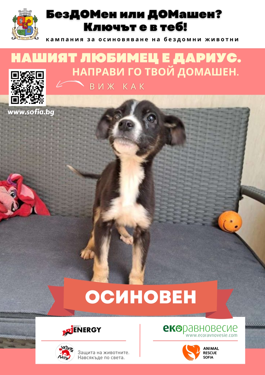 Дариус е настанен заедно със своето братче и сестриче в приют "Сеславци". Кутретата са изключително енергични и игриви, а Дариус е строен млад момък, обичащ да позира. На трите кученца скоро им предстои да бъдат кастрирани, а след това кротко и тихо ще Ви очакват, за да допълнят семейството с любов, щастие и игра.