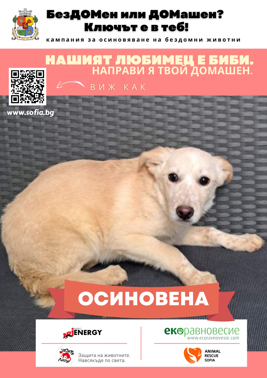 Януарска утрин, пред приюта ни в кв. "Сеславци" търпеливо чакат четири прекрасни кутрета. Да, приятели, три момичета и едно момче са изоставени в транспортни клетки на 04.01.2023 г. Бебоците са прегледани от ветеринарен лекар, обезпаразитени, ваксинирани и настанени в приюта ни. Биби е страхотно кутре! Обича да се гушка, да похапва и да играе! Кротко и добродушно куче, което очаква своя нов дом! Бъдещите осиновители могат да бъдат сигурни, че ще получат цялата любов на света!