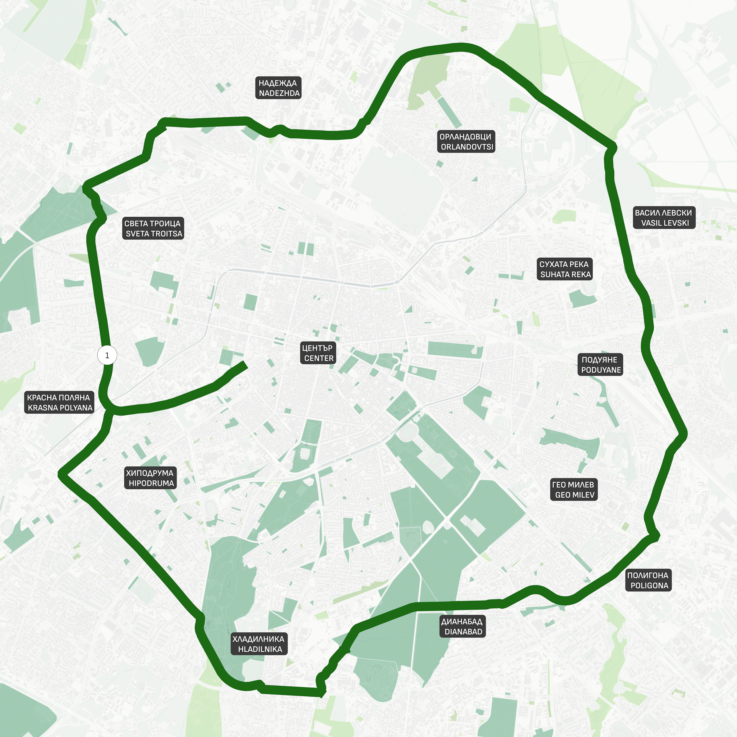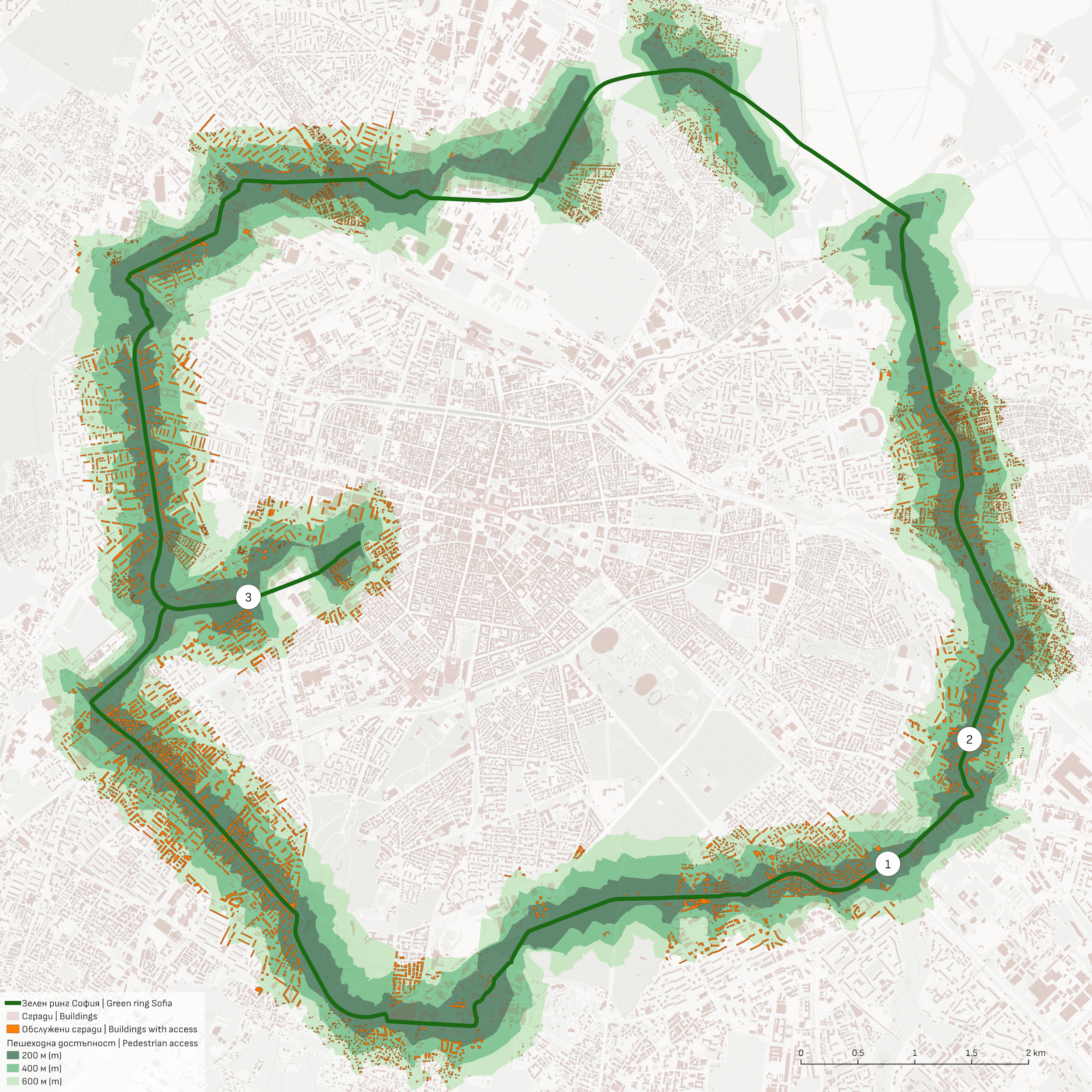 Зелен ринг София е реалистичен проект за линеен парк, който ще осигури пешеходен достъп до зелени площи на над 250 хиляди души в над 30 жилищни квартала. Около 80% собствеността на земята е общинска и държавна, а устройствените зони от ОУП са предимно за озеленяване, паркове и градини и обществено обслужване. Трасето преминава основно през резервирани, неурбанизирани територии, които ще бъдат важен фактор за изграждане на гръбнак на пешеходната и велосипедната инфраструктура.