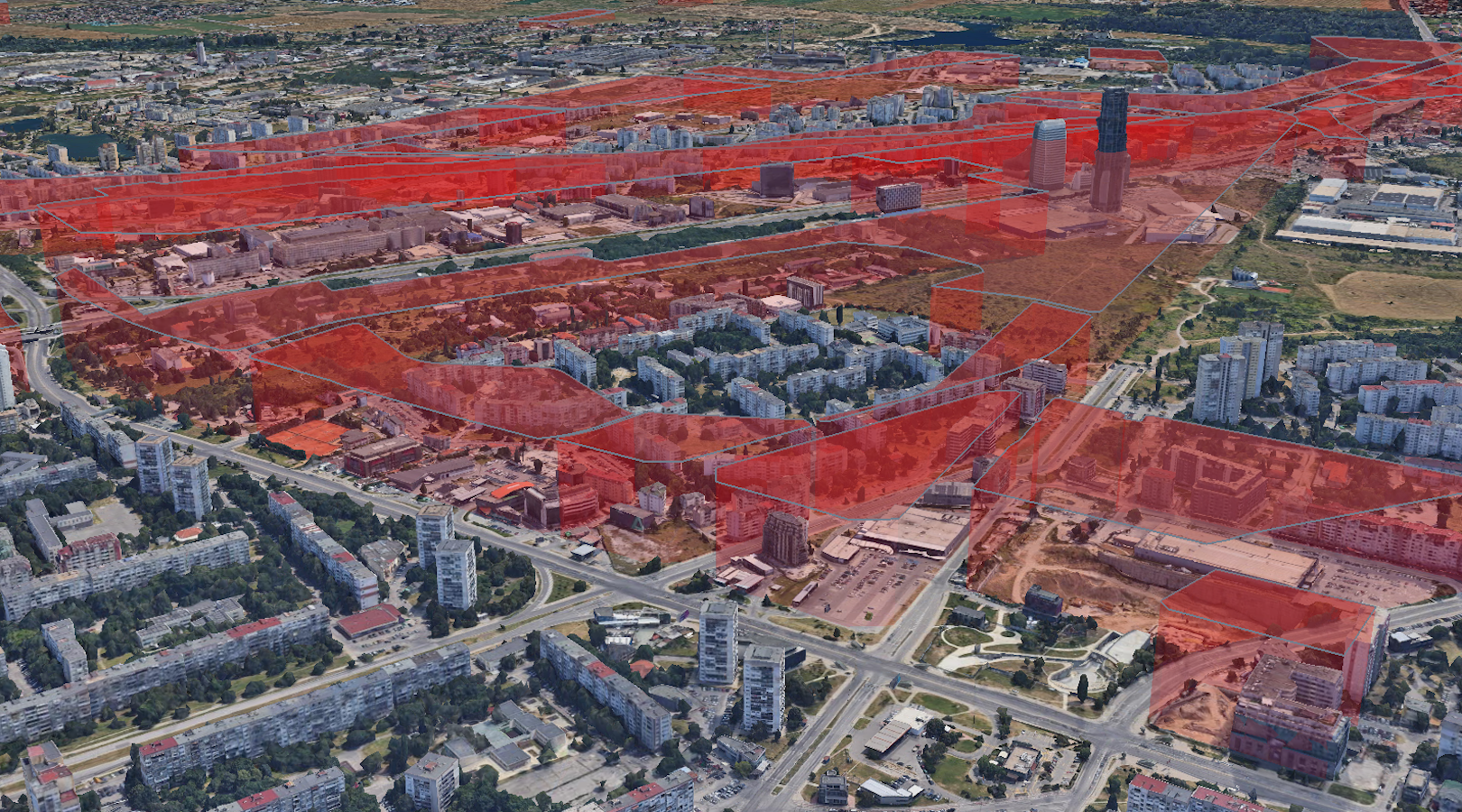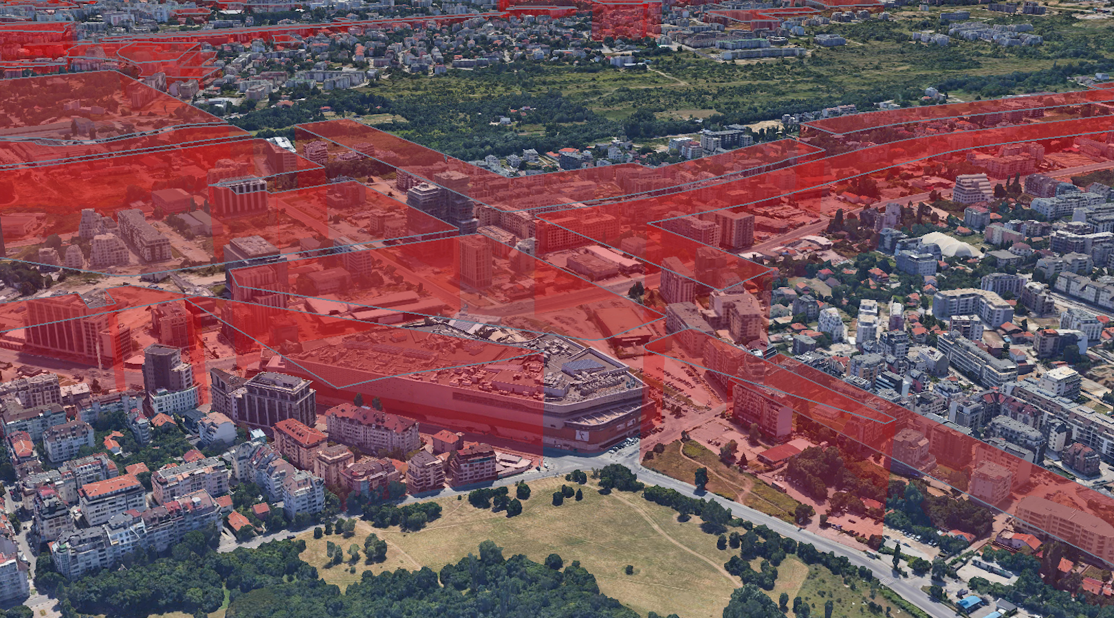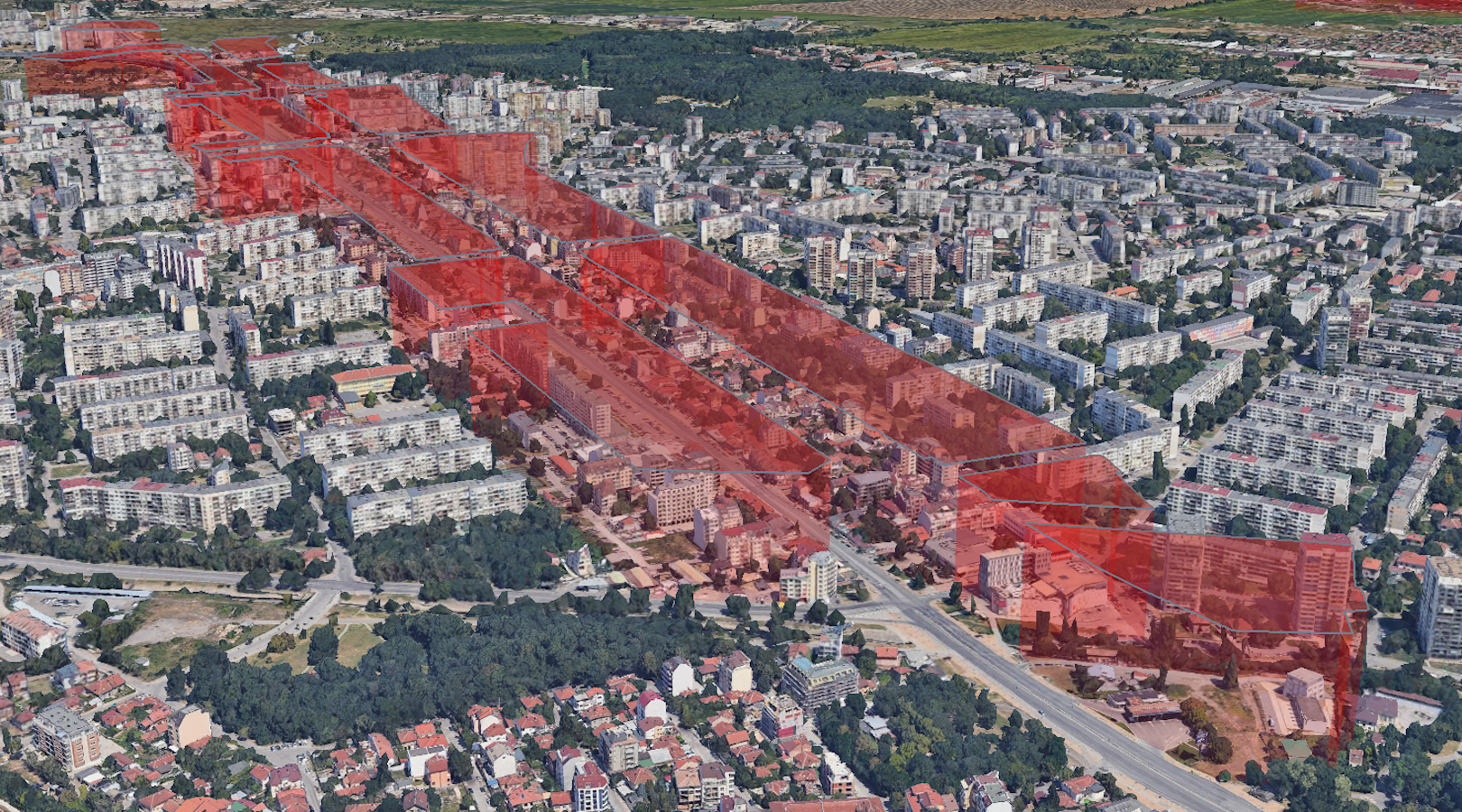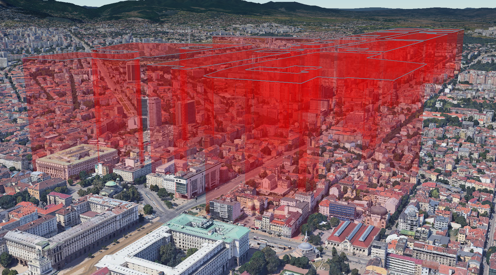 Общият устройствен план на Столична община определя различни параметри и ограничения на застрояването, един от които е максималната височина, която сградите в различни зони могат да достигат. Визуализациите показват този параметър на няколко места в София. Маркирани в червено се виждат вертикални очертания, както и 3D модели на съществуващите сгради за сравнение.