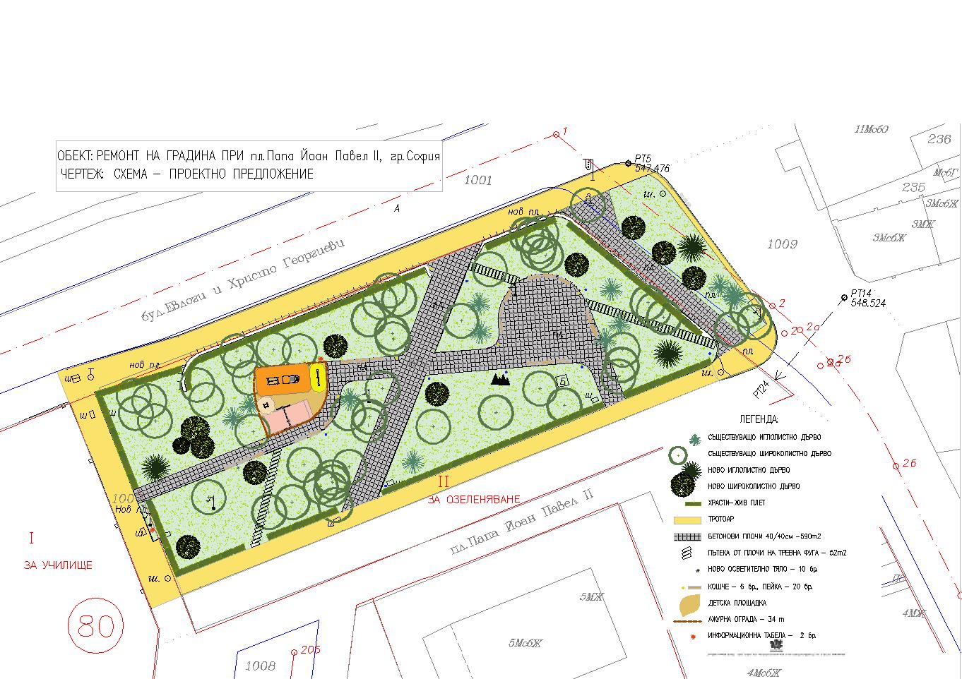 Започна ремонтът на градината на площад „Папа Йоан Павел Втори“. Строителните дейности включват  пълно обноваване на  градината, изграждане на  осветление с нови стълбове и осветителни тела, полагане на нова настилка от бетонови плочи и бордюри. Ще бъде  изградена и нова детска площадка на мястото на старата. Спазвайки традицията след демонтажа на старото детско влакче, ще бъде поставено ново комбинирано съоръжение – влакче и люлка.