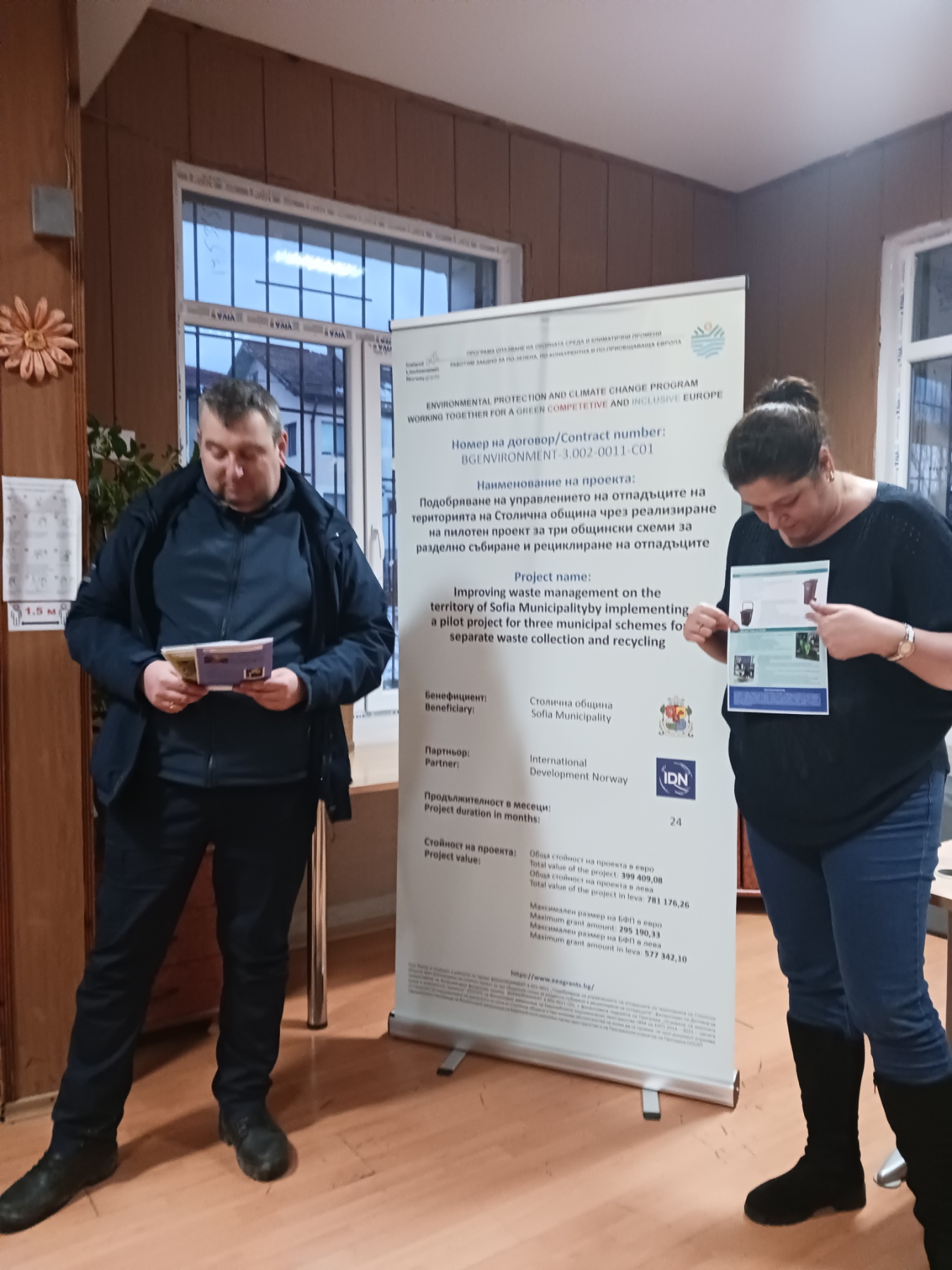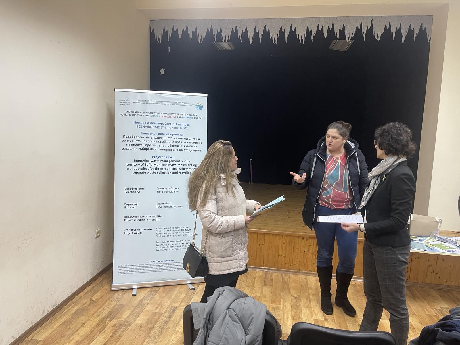 Проведоха се информационни срещи с жителите на три столични квартала по проект „Подобряване на управлението на отпадъците на територията на Столична община чрез реализиране на пилотен проект за три общински схеми за разделно събиране и рециклиране на отпадъците“ на Столична община.