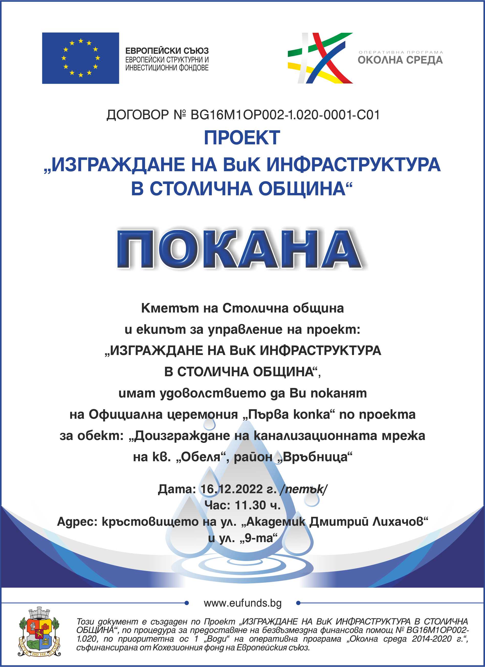На 16 декември 2022 г. в столичния район „Връбница“ се проведе официална церемония „Първа копка“ за стартиране на строителните дейности по доизграждане канализационна мрежа в квартал „Обеля“. Събитието се провежда в изпълнение на проект „Изграждане на ВиК инфраструктура в Столична община“ с обща стойност 140 495 700,84 лв., от които 96 478 397,78 лв. – безвъзмездна финансова помощ, и 44 017 303,06 лв. собствен принос, финансиран по Оперативна програма „Околна среда 2014 – 2020 г.“, съфинансирана от Европейския фонд за регионално развитие и Кохезионния фонд на Европейския съюз.