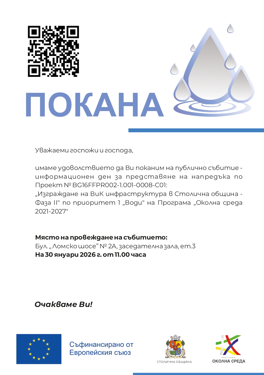 На 30.01.2026 г. се проведе информационен ден за представяне на напредъка по Проект № BG16FFPR002-1.001-0008-C01: „Изграждане на ВиК инфраструктура в Столична община - Фаза II" по приоритет 1 „Води" на Програма „Околна среда 2021-2027". Проектът, започнал своето изпълнение през 2022 г. с подписването на АДБФП № BG16M1OP002-1.020-0001-C01 между Столична община и Управляващия орган на Оперативна програма „Околна среда 2014 – 2020“, по приоритетна ос „Води“, предвижда изграждането на преобладаващо разделна канализационна система за отвеждане на отпадъчни води от седем агломерации на столичния град, което повишава в значителна степен качеството на живот и създава необходимите условия за опазване на околната среда.
