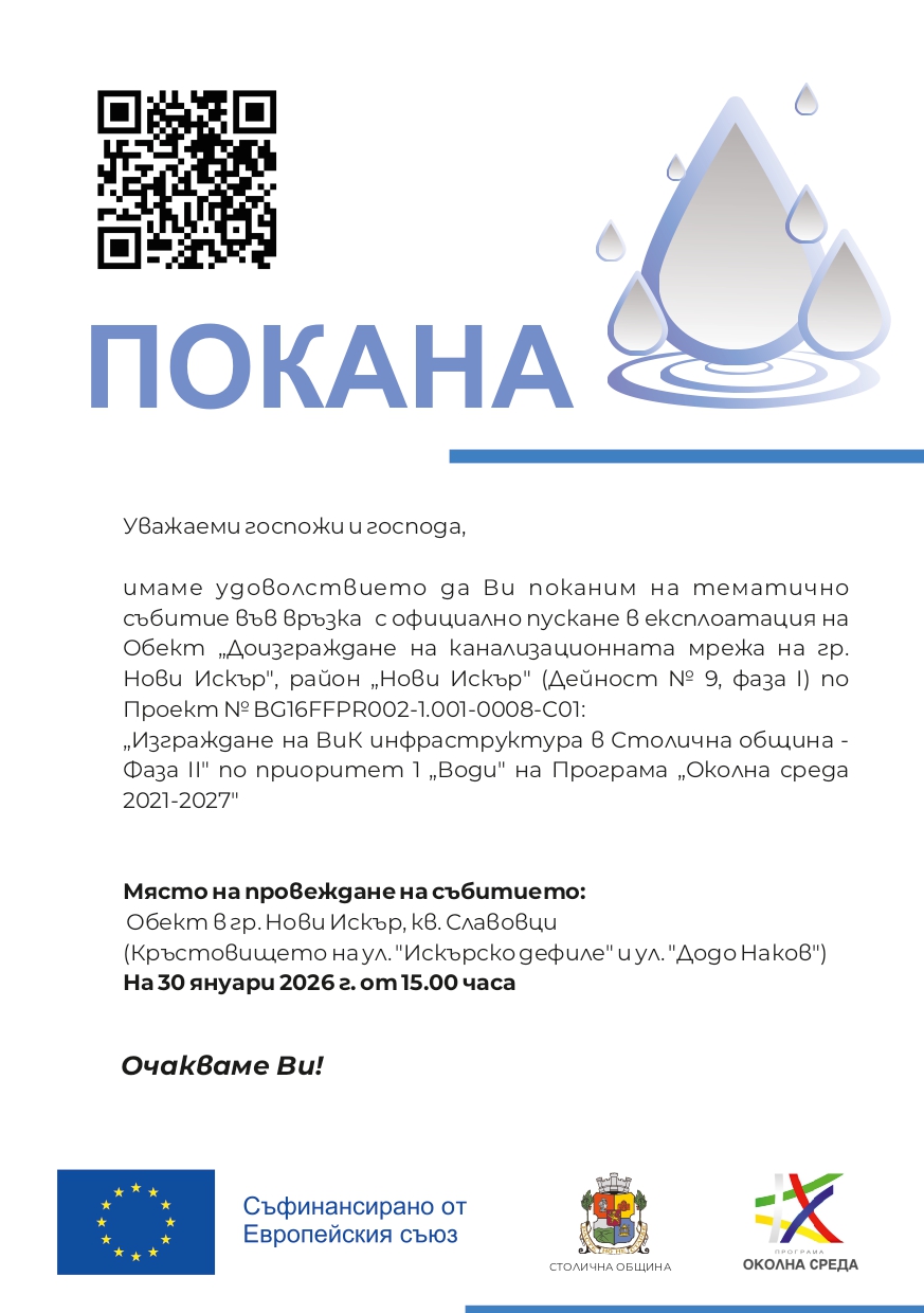 На 30.01.2026 г. се проведе официалното пускане в експлоатация на обект „Доизграждане на канализационната мрежа на гр. Нови Искър", район „Нови Искър" (Дейност № 9, фаза I) по Проект № BG16FFPR002-1.001-0008-C01: „Изграждане на ВиК инфраструктура в Столична община - Фаза II" по приоритет 1 „Води" на Програма „Околна среда 2021-2027". Обектът е изпълнен в два етапа между двата програмни периода - фаза I с финансиране от Оперативна програма „Околна среда 2014-2020 г.“ и фаза II с финансиране от Програма „Околна среда 2021-2027 г.“. Общата стойност на обекта е 23 904 000,00 лв.