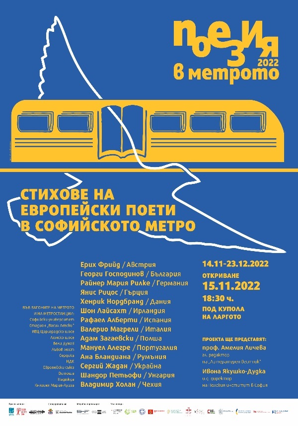 „ПОЕЗИЯ В МЕТРОТО ни предлага стихотворения на европейски поети, обединени от темата за мира и свободата. Пътуващите могат да прочетат в оригинал и в превод на български стиховете на 14 автори. В селекцията е и творба на Георги Господинов“ – разказа заместник-кметът на София Мирослав Боршош за седмото издание на инициативата „Поезия в метрото“, която се реализира до 23 декември с подкрепата на Столичната община.