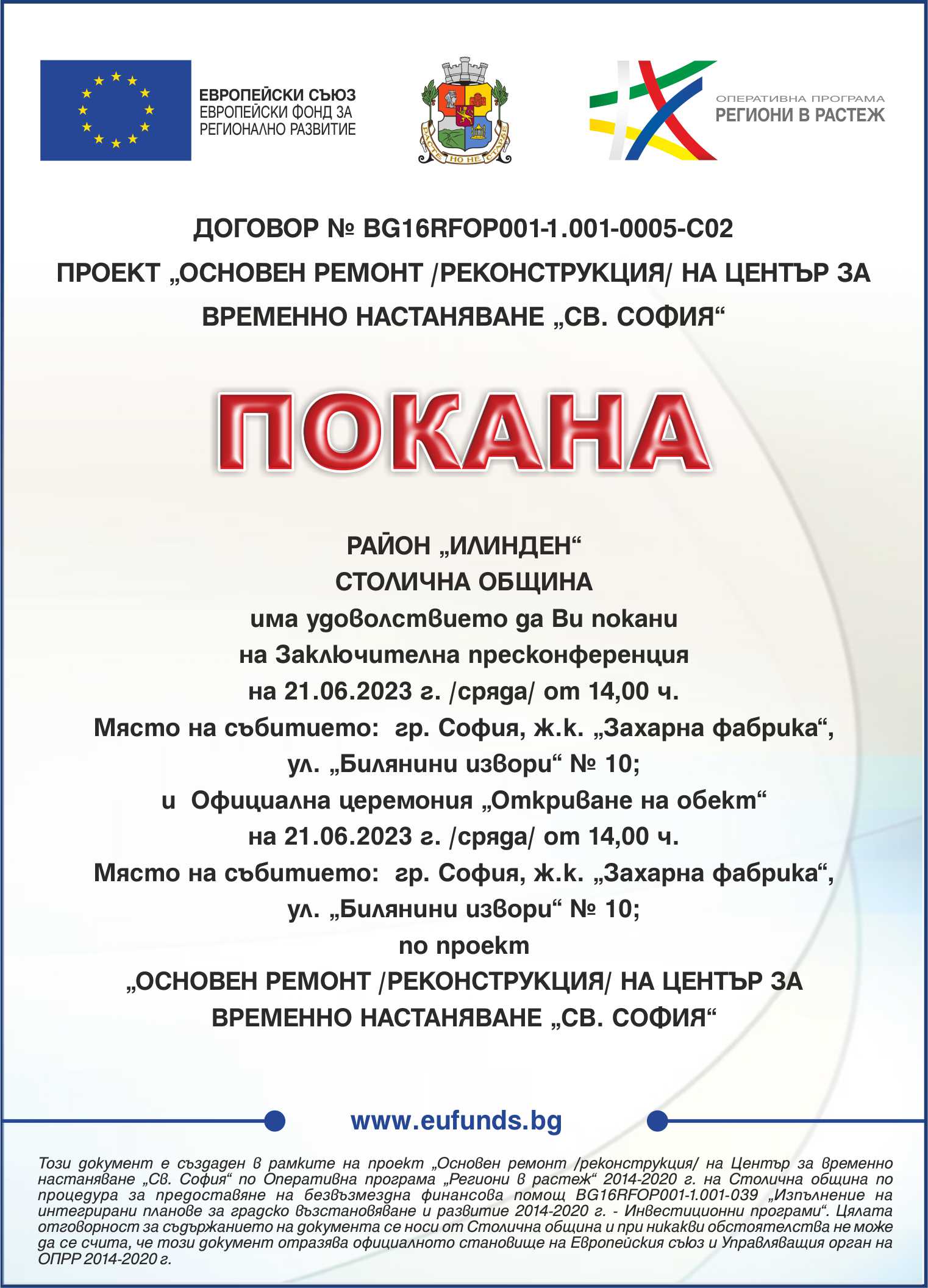 по проект „ОСНОВЕН РЕМОНТ (РЕКОНСТРУКЦИЯ) НА ЦЕНТЪР ЗА ВРЕМЕННО НАСТАНЯВАНЕ „СВ. СОФИЯ“.