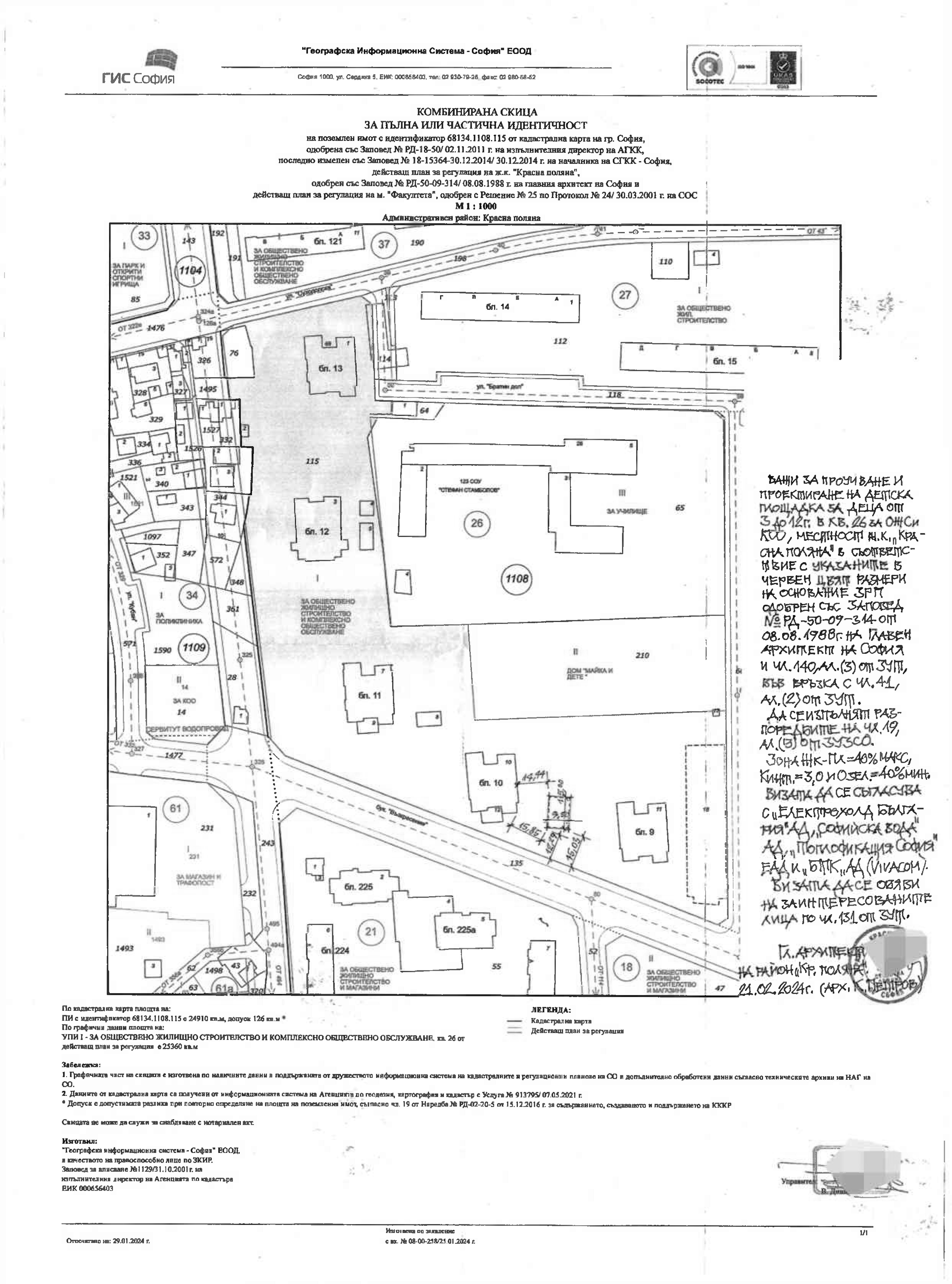 Район „Красна поляна” – СО, на основание чл. 20, чл. 5 от Наредбата за реда и начина за провеждане на обществени обсъждания в областта на пространственото развитие и устройството на територията на Столична община, приета с Решение № 661 по Протокол № 41/12.10.2017 год. на СОС, съобщава, че е издадена Заповед № РКП23-РД56-90/27.02.2024 год. от кмета на район „Красна поляна” за провеждане на обществено обсъждане на виза за проучване и проектиране на детска площадка за деца от 3 до 12 год., издадена от главния архитект на район „Красна поляна” на 21.02.24 год., в ПИ с идентификатор 68134.1108.115, УПИ I-за ОЖС и КОО, кв. 26, м. ж.к. „Красна поляна”.