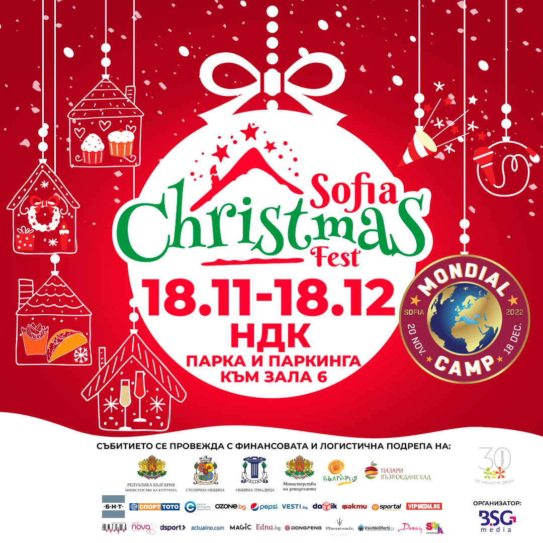 Софийски коледен фестивал ще се проведе за първи път от 18 ноември до 18 декември в пространството зад Националния дворец на културата (пред зала 6). Пъстра програма с концерти, представления, забавления, кулинарни преживявания, както и емоции със Световното първенство по футбол ще предложи фестивалът. Ще се играят театрални постановки, кабаре спектакли, ще има много събития за деца, Pop Up и земеделски базари. Фестивалът ще отваря в 12:00 ч. от понеделник до петък, през уикендите – от 11:00 ч.