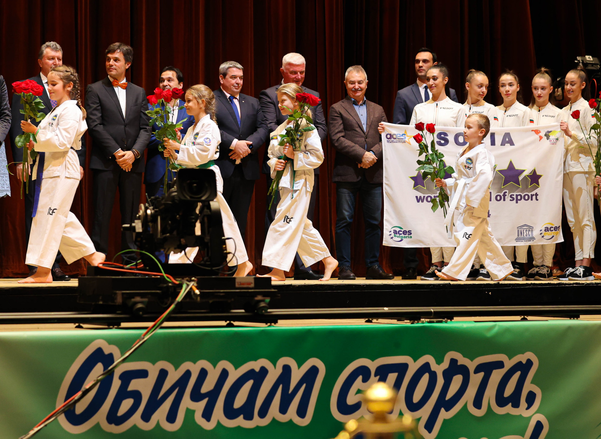 Деца от Централната школа по таекуон-до връчиха на всички официални гости и легендарни спортисти на сцената червени рози от един от най-зелените и гостоприемни градове на Европа – София, от днес вече и официално „световна столица на спорта“, а кратък видеоклип припомни с атрактивни кадри направеното досега през последните осем години.