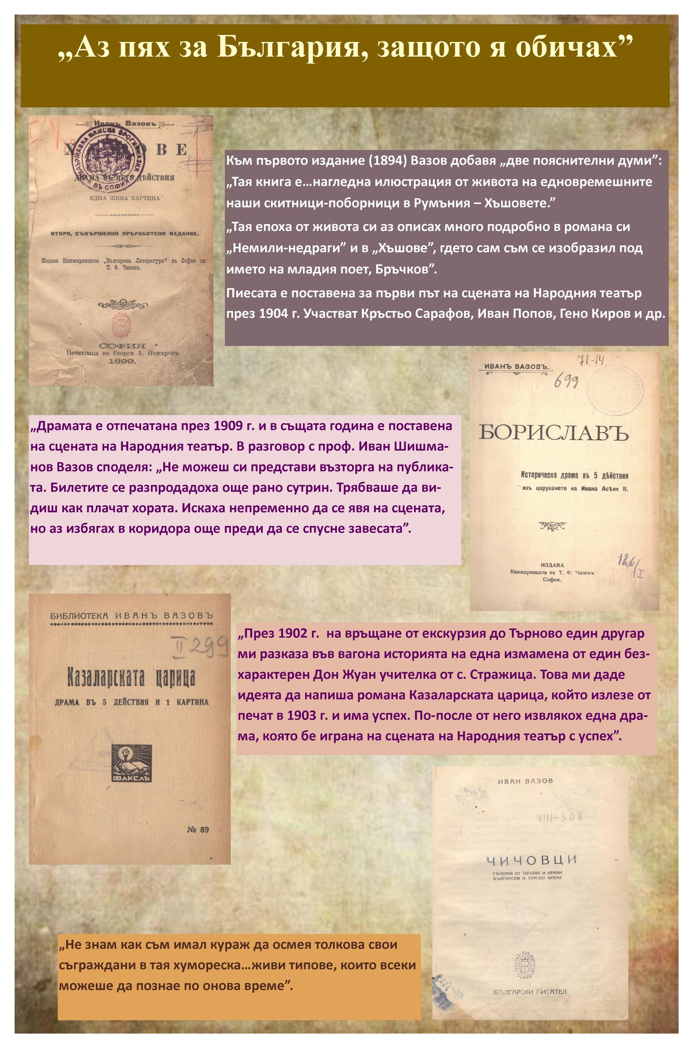 Акценти в изложбата са „Под игото“ – първото българско и английското издание на романа, което излиза само няколко месеца преди българското през 1894 г. „Стихотворения за малки деца“ от 1883 г., написани за три дни по поръчка от издателя Д. В. Манчов за 200 франка. Трите му първи стихосбирки: „Пряпорец и гусла“, издадена под псевдонима му Пейчин в Румъния през 1876 г., „Тъгите на България“, издадена в Букурещ през 1877 г. и подписана с истинското име на автора, и „Избавление“ – 1878 г., както и юбилейните книги от честванията на Вазов през 1920 г. Представени са и някои от периодичните издания, на които Иван Вазов е редактор и публикува свои творби под различни псевдоними.