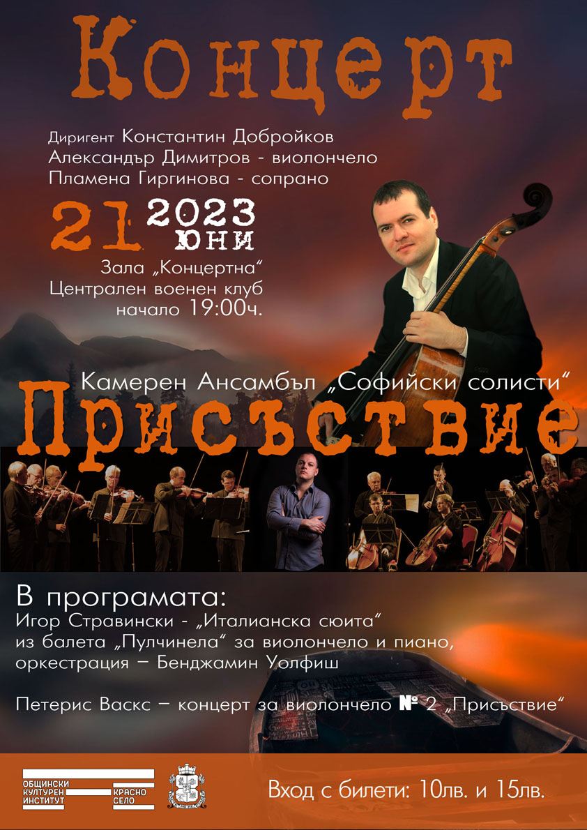 На 21 юни от 19:00 ч. в Централния военен клуб Камерен ансамбъл „Софийски солисти“ ще представи за първи път в България Концерт за виолончело № 2 „Присъствие“ на Петерис Васкс. „Италианска сюита“ за виолончело и пиано от Игор Стравински из балета „Пулчинела“ (оркестрация на Бенджамин Уолфиш) допълва програмата на вечерта. Диригент ще бъде маестро Константин Добройков. Концертът е част от Международния фестивал „Софийски музикални седмици“ в Календара на културните събития на Столична община.