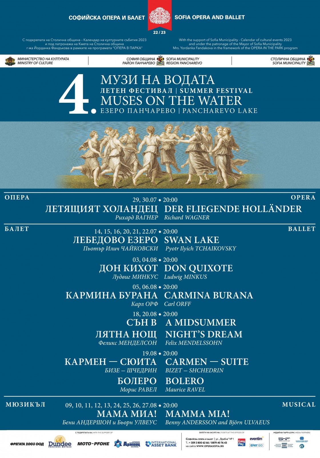 От 14 юли до 27 август фестивал „Музи на водата“ на езерото Панчарево се реализира от Софийската опера и балет с подкрепата на Столична община в Календара на културните събития на София.