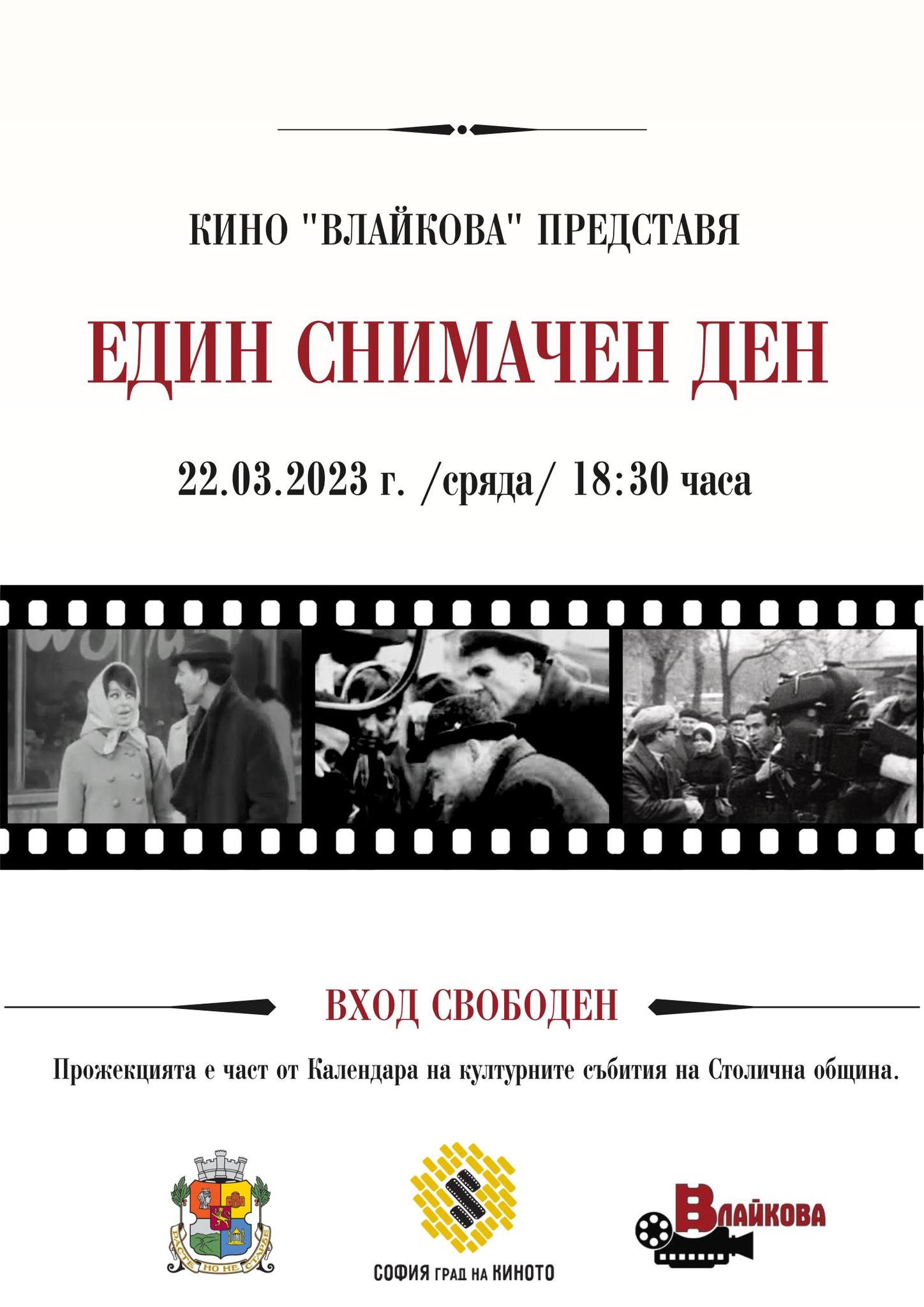 Филмът "Един снимачен ден" ще бъде показан на 22 март (сряда) от 18:30 часа в кино "Влайкова". Прожекцията е част от Календара на културните събития на Столична община '2023 година и е посветен на 126-годишнината от първата прожекция в София. Събитието се организира от дирекция „Култура“ на Столичната община и кино "Влайкова".