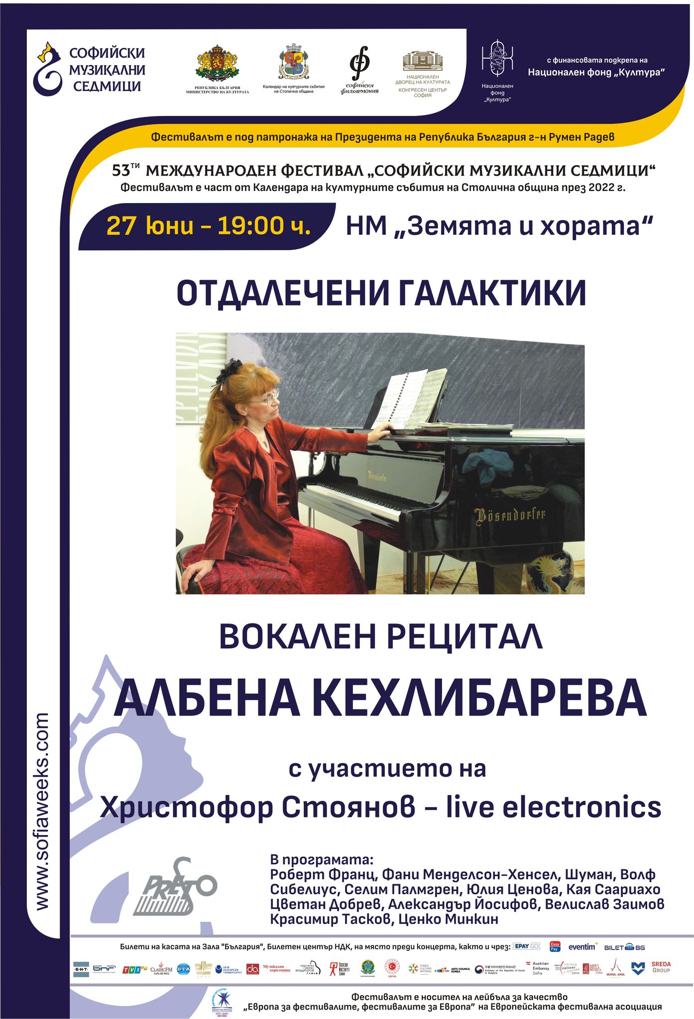 Тази година на сцената на Международния фестивал "Софийски музикални седмици" ще се проведе един специален концерт на проф. Албена Кехлибарева – мецосопран, пиано, орган. Програмата на изпълнителката е изключително богата и наситена със световни и български премиерни творби. Само част от авторите, които ще бъдат представени същата вечер, са Роберт Франц, Александър Йосифов, Димитър Христов, Велислав Заимов, Хуго Волф, Ценко Минкин и др.