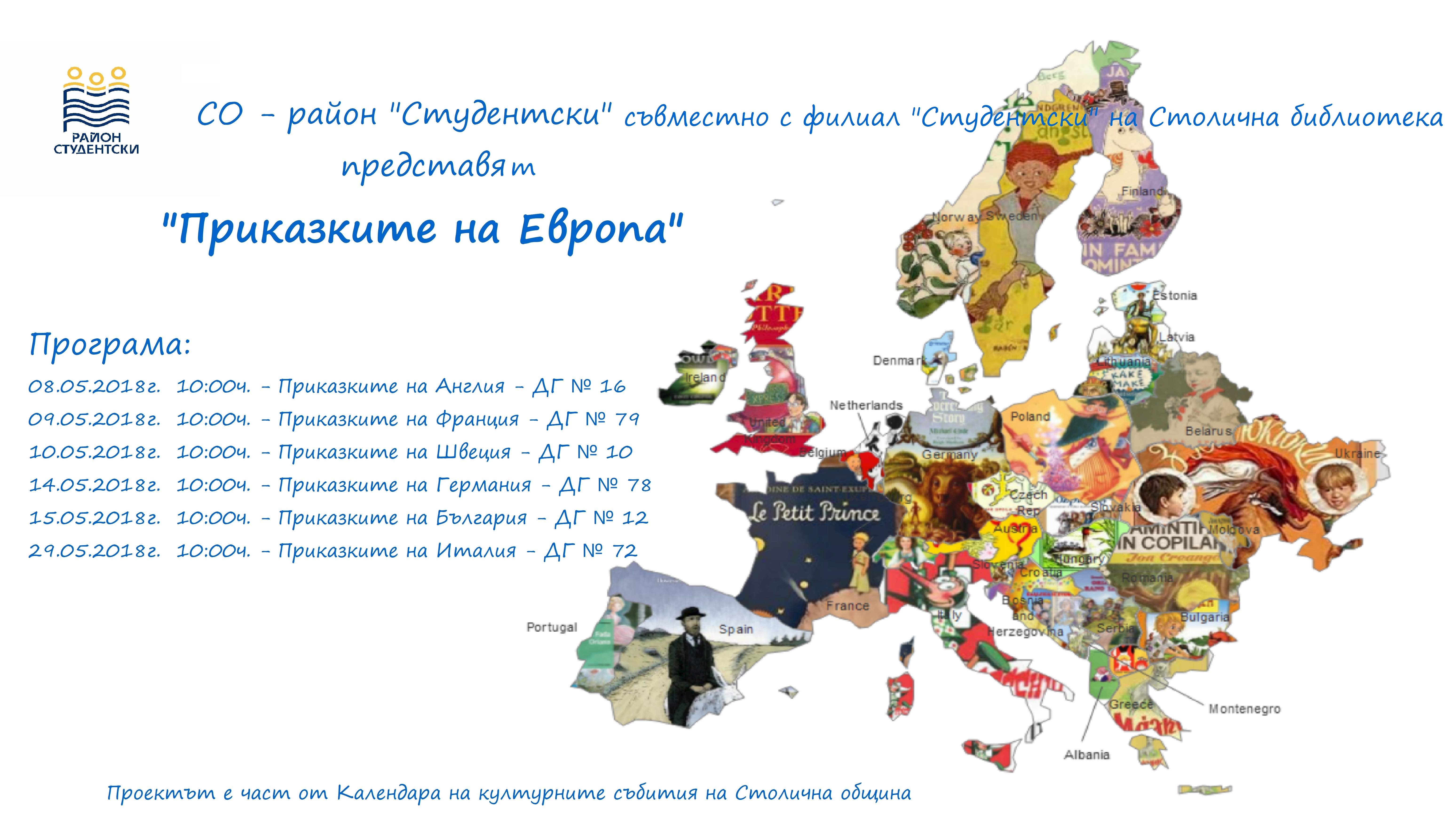 По повод Българското европредседателство и Деня на Европа – 9 май, СО – район „Студентски“ стартира нов проект – „Приказките на  Европа“.  В периода от 8.05. до 29.05.2018 г. децата от подготвителните групи на 6-те детски градини ще посетят филиал „Студентски“ на Столична библиотека, където ще научат интересни факти от творчеството и живота на известни детски писатели.
