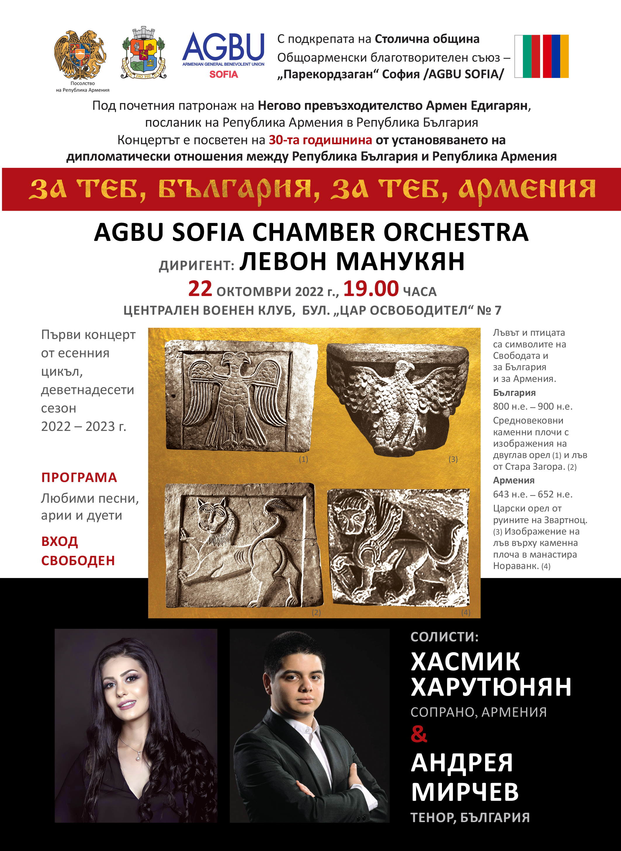 На 22 октомври (събота) от 19:00 часа в Централен военен клуб ще се проведе концерт на AGBU Sofia Chamber Orchestra под надслов "За Теб, България, за Теб, Армения". Входът е свободен.