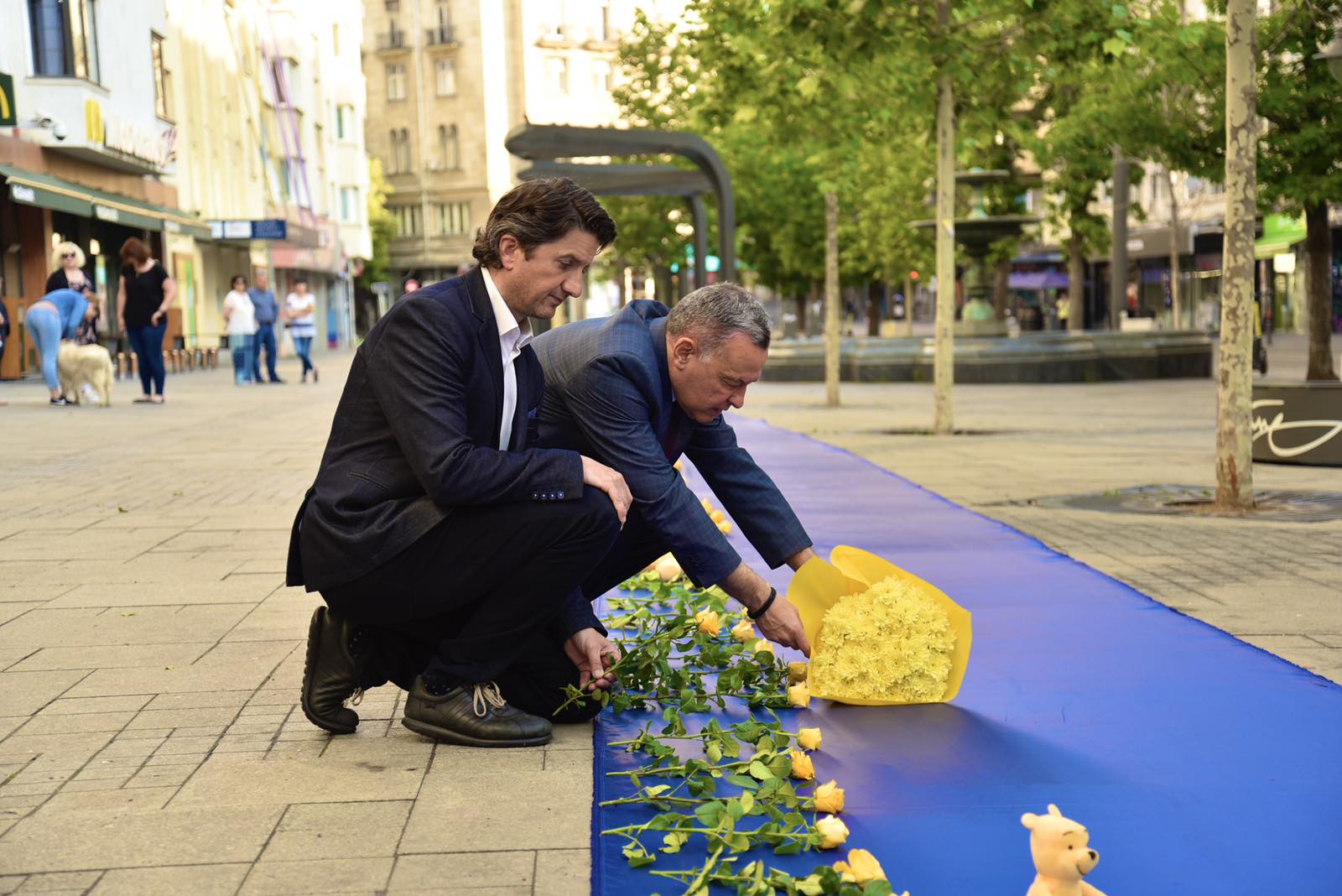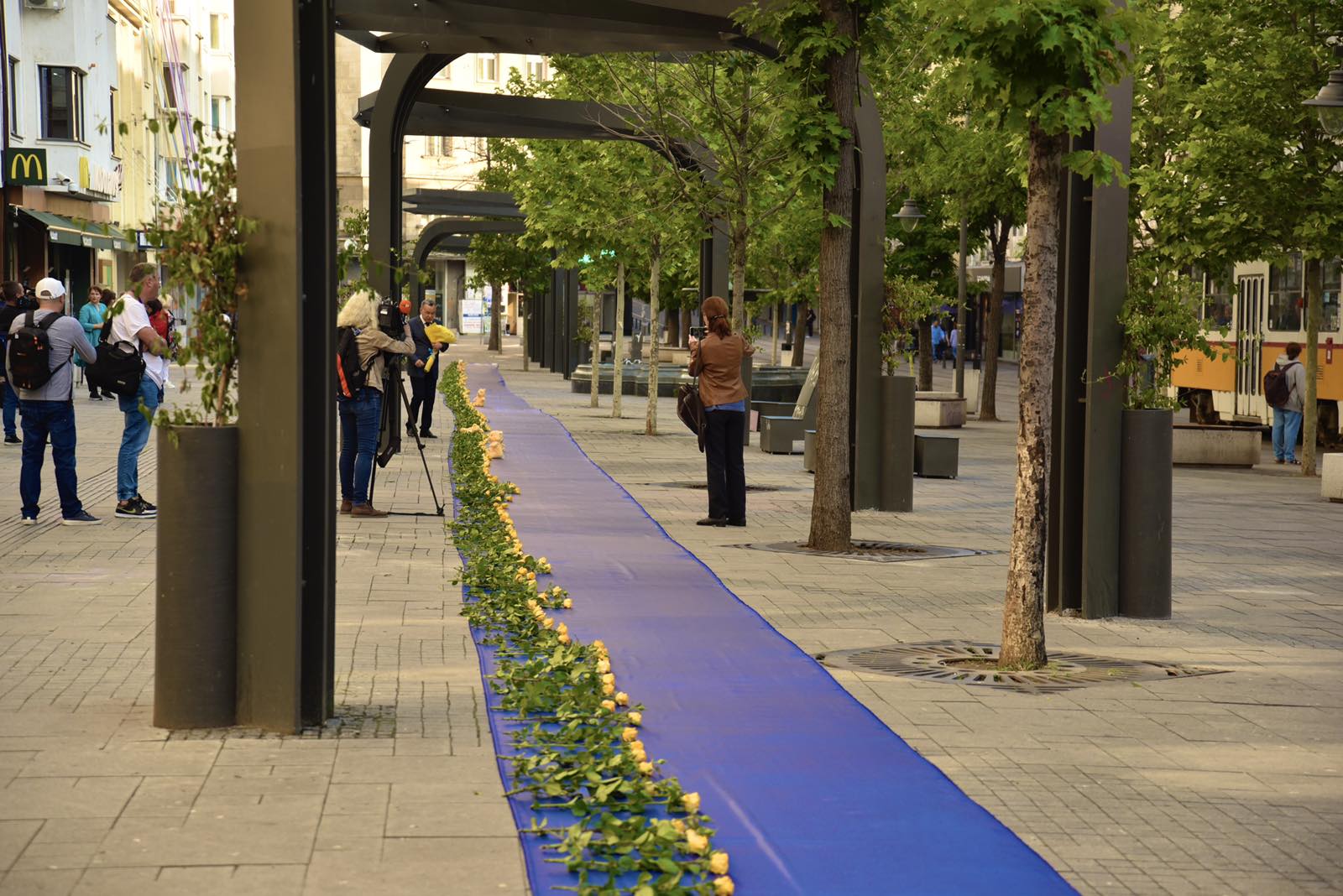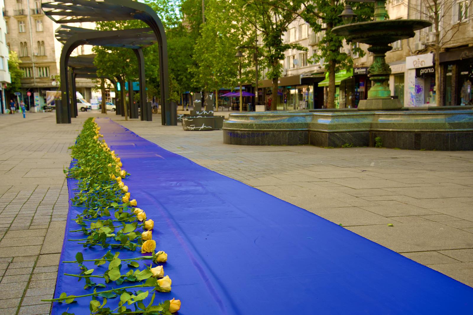 100-метрово синьо платно с жълти рози и играчки е поставено на столичния площад „Славейков”.