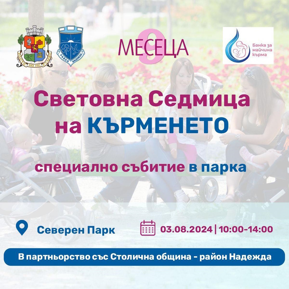На 3 август 2024 г. (събота), от 10:00 до 14:00 ч, списание "9 месеца", Банка за майчина кърма и район "Надежда" отбелязват Световната седмица на кърменето със специално събитие за настоящи и бъдещи майки в Северен парк.