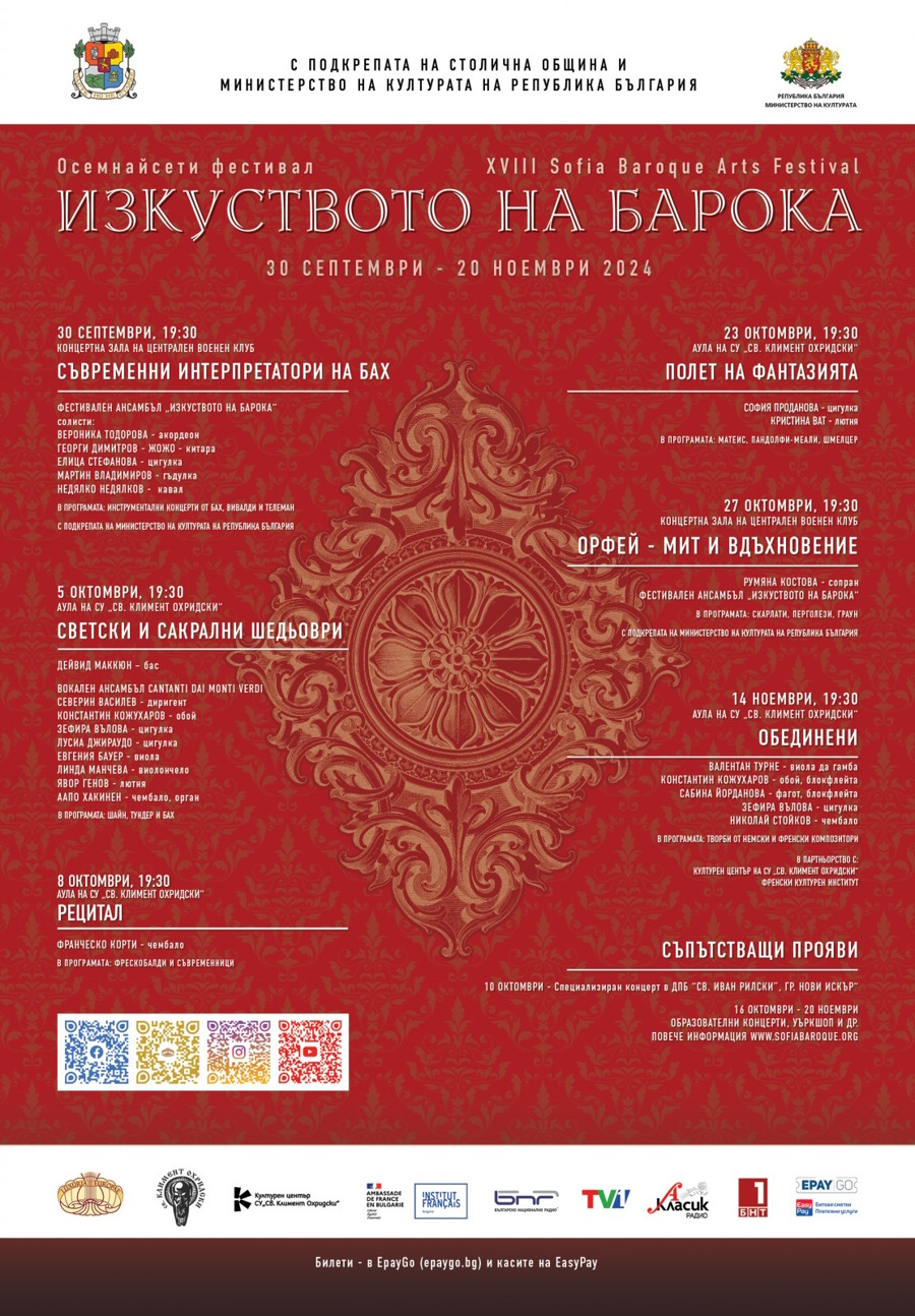 Осемнадесетото издание на фестивал "Изкуството на барока" се реализира с финансовата подкрепа на Столичната община в Календара на културните събития на София от 30 септември до 20 ноември.