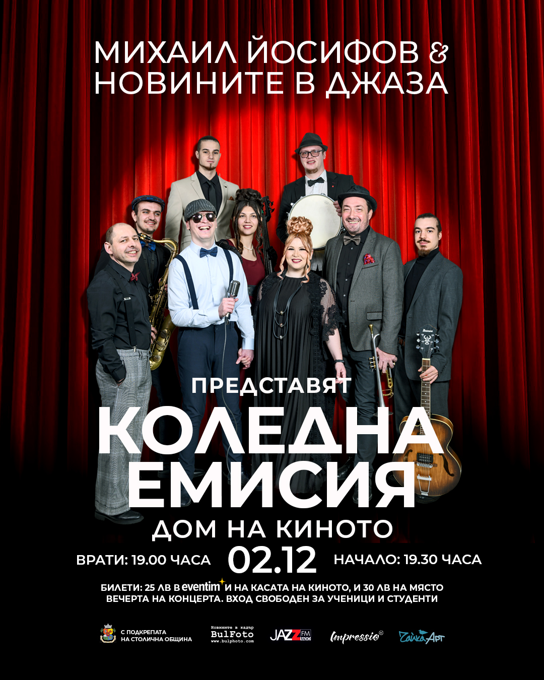 На 2 декември (понеделник) от 19:30 ч. в Дома на киното в уютна зимна среща Михаил Йосифов и Формация "Новините в джаза" представят "Коледна емисия". Концертът се осъществява с финансовата подкрепа на Столичната община – Програма "Култура". Входът е свободен за ученици и студенти.
