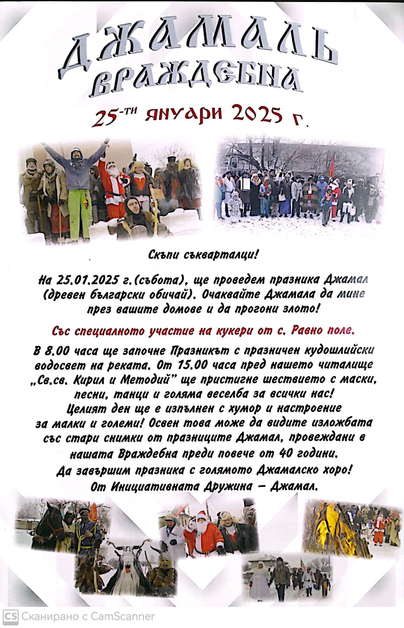 На 25.01.2025 г. (събота) в кв. "Враждебна" ще се проведе празникът Джамал. Празникът е традиционен за населеното място и се провежда от 40 години насам. Ще започне в 8:00 часа с водосвет на реката и в рамките на целия ден. Инициативната Дружина „Джамал“ със специалното участие на кукери от с. Равно поле ще изпълнят събитието с хумор и настроение. Пред Народно читалище „Св. св. Кирил и Методий - 1926" ще има шествие с маски, песни и танци. Гражданите ще могат да разгледат и тематична изложба със снимки от 40 години празнуване на Джамал във "Враждебна" и да се включат в голямо Джамалско хоро за малки и големи.
