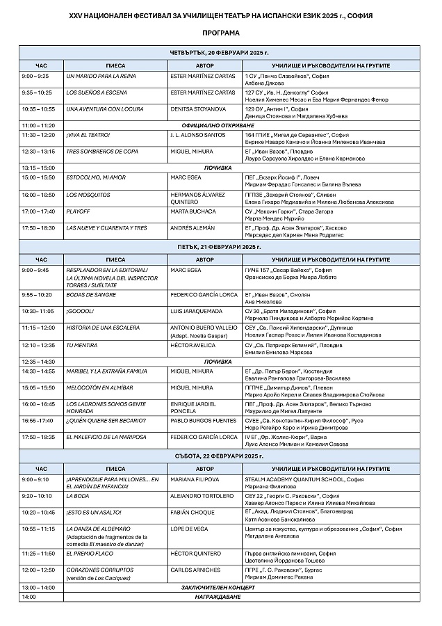 На 20, 21 и 22 февруари в София ще се проведе XXV Национален фестивал за училищен театър на испански език. Във фестивала, организиран от отдел "Образование" към Посолството на Испания в България, ще участват ученически групи от 25 училища от цялата страна.