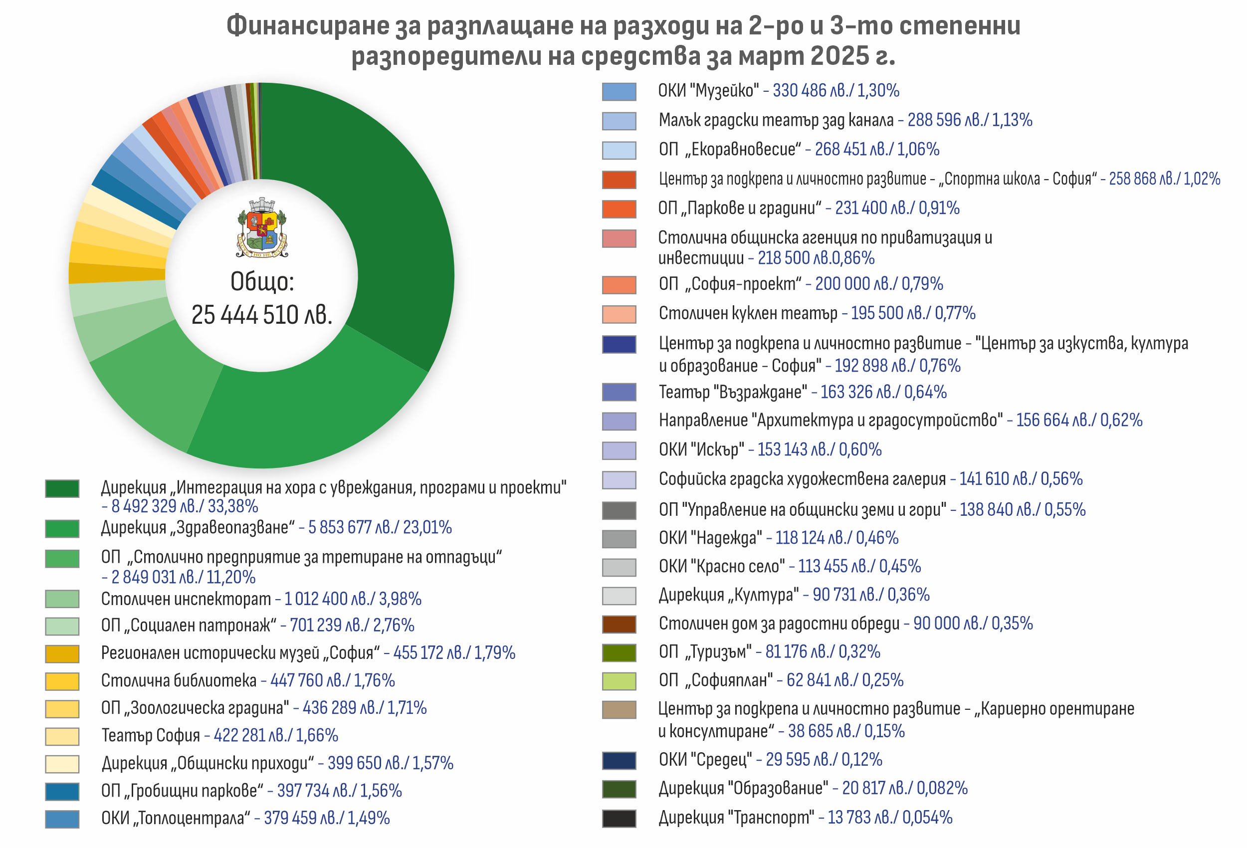 Общо разплатените от Столична община средства през третия месец на годината са – 209 814 778 лв. От тях извършените плащания директно от Столична община са в размер на 70 080 986 лв., което е 35,78% от общите разплащания за месеца.