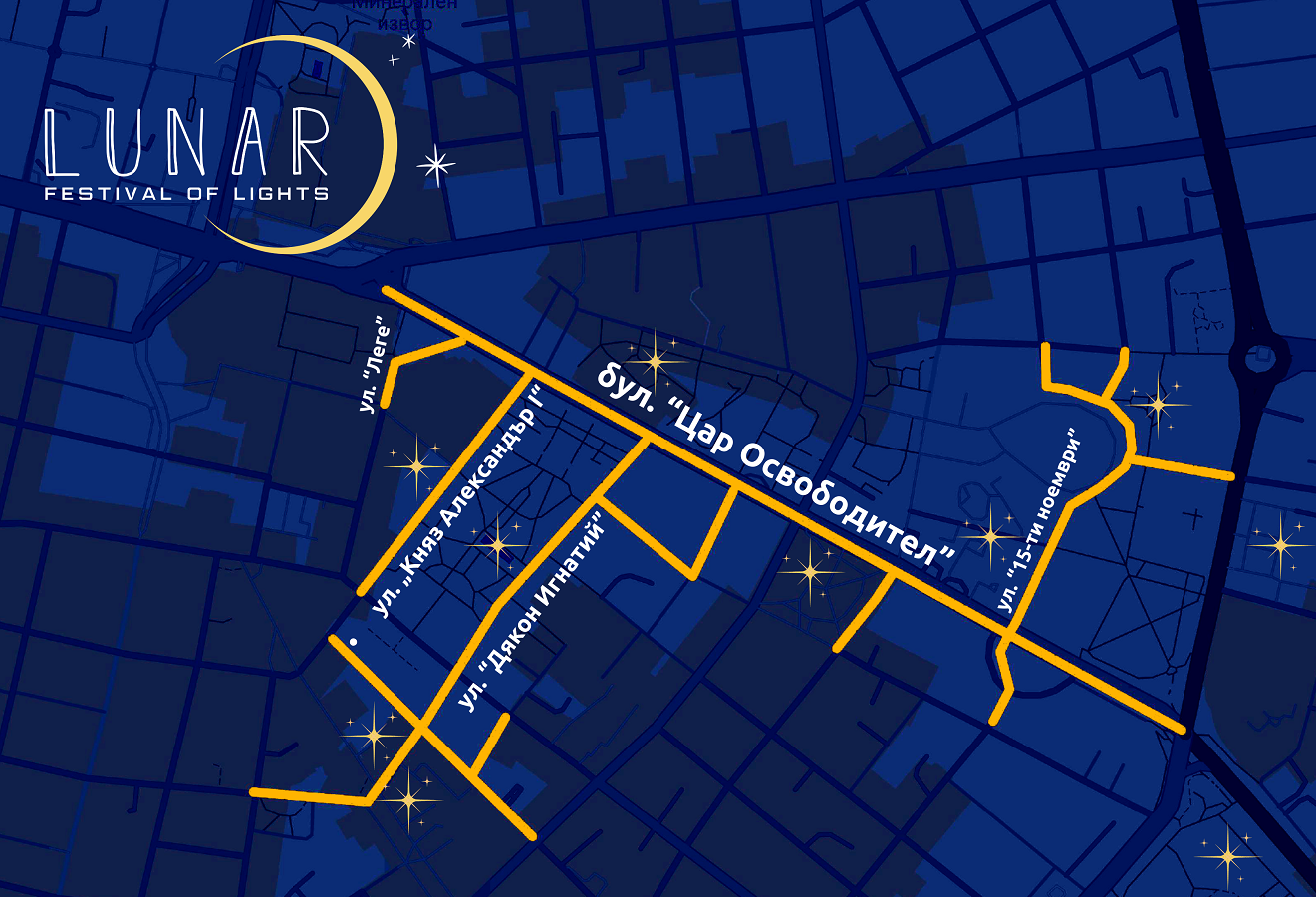 Посетителите на LUNAR ще имат възможност да видят някои от акцентите в програмата в пълния им блясък, благодарение на въведената забрана за престой и паркиране на пътни превозни средства, от 18:30 до 24:00 ч., между 8 – 11 май, на следните локации: