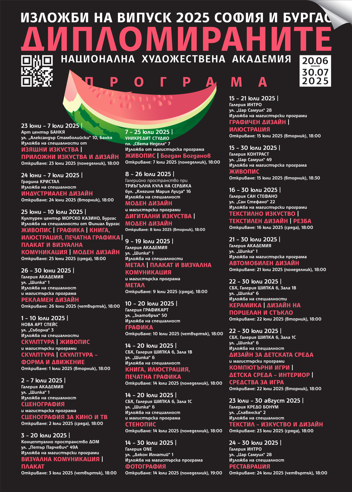 Галерии в София, Банкя и Бургас представят изложби с дипломните работи и проекти на над 200 студенти от всички специалности и магистърски програми в Националната художествена академия. Проектът "Изложби на дипломираните студенти от Националната художествена академия – випуск '2025 година" представя до 7 юли в "Артцентър Банкя" сборна изложба "Изящни изкуства, приложни изкуства и дизайн" на дипломирани студенти от специалностите "Живопис", "Графика", "Книга, илюстрация, печатна графика", "Плакат и визуална комуникация", "Индустриален дизайн" и "Дизайн за детската среда" на Академията.