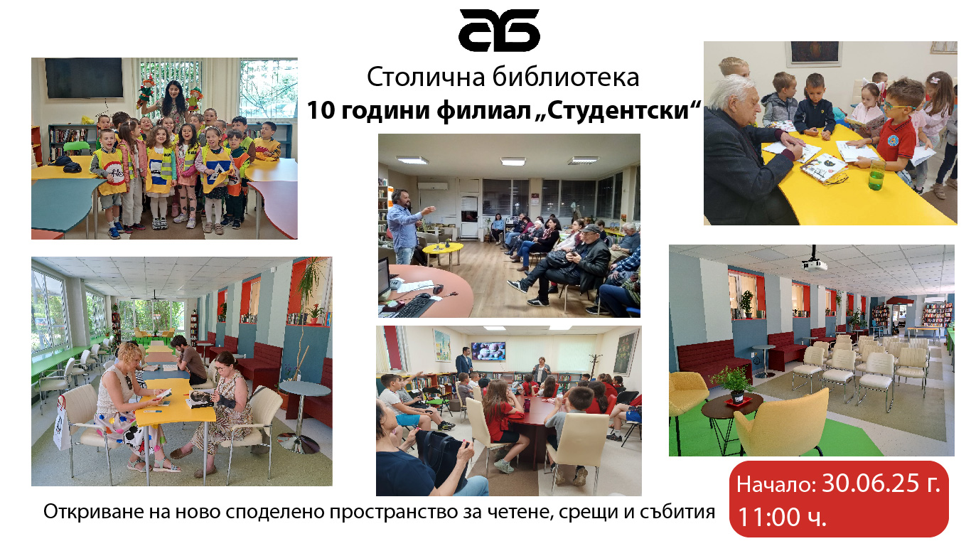 На 30 юни т.г. от 11:00 ч. в най-младежкия филиал "Студентски" на Столичната библиотека ще бъде открито ново споделено пространство за четене, срещи и събития със специалното участие на популярните български автори – приятели на Столична библиотека – Захари Карабашлиев, Мирела Иванова, Амелия Личева, които ще прочетат свои творби и раздадат книги с автографи. Музикален поздрав ще отправят постоянните ни артпартньори – певицата Ели Раданова, саксофонистът Иван Бороджиев, пианистът Венци Дреников. Свои стихотворения ще прочетат и младите участници в шампионата по поезия „Млада метафора“.