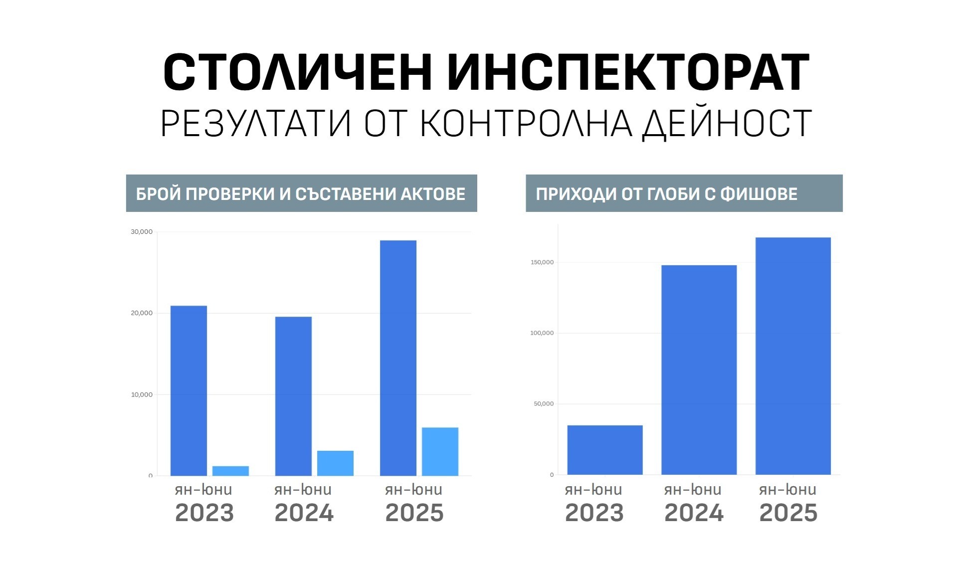 През първото полугодие на 2025 г. Столичният инспекторат е извършил с 48% повече проверки в сравнение със същия период на 2024 г. – от 19 564 броя на 28 958 броя.