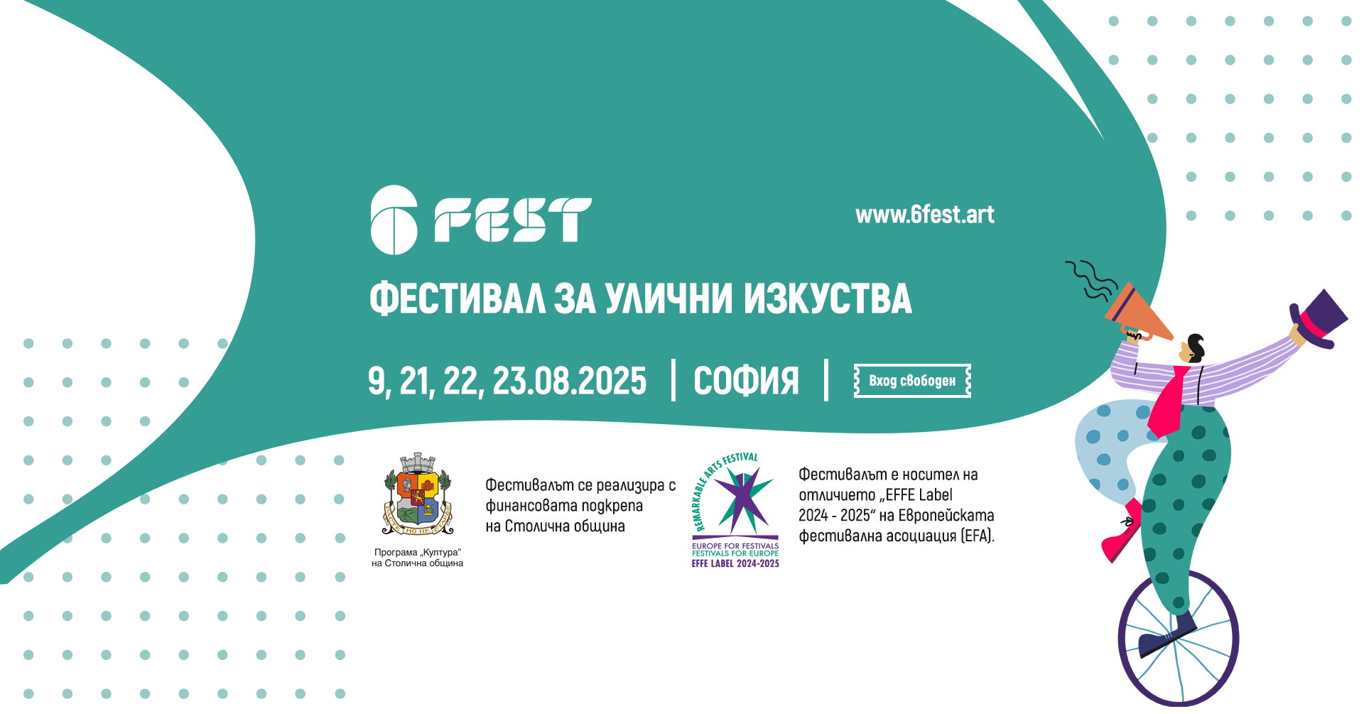 ​​​​​​"6Fest София 2025 | Международен фестивал за улични изкуства" кани на първото си голямо самостоятелно международно издание в София, което ще се реализира през август с финансовата подкрепа на Столичната община – Програма "Култура".