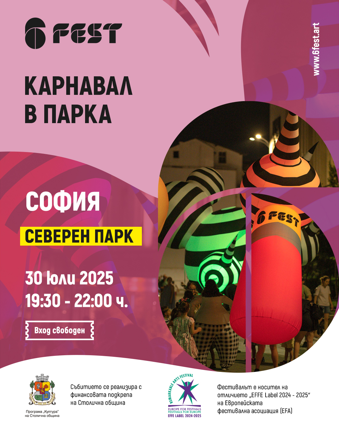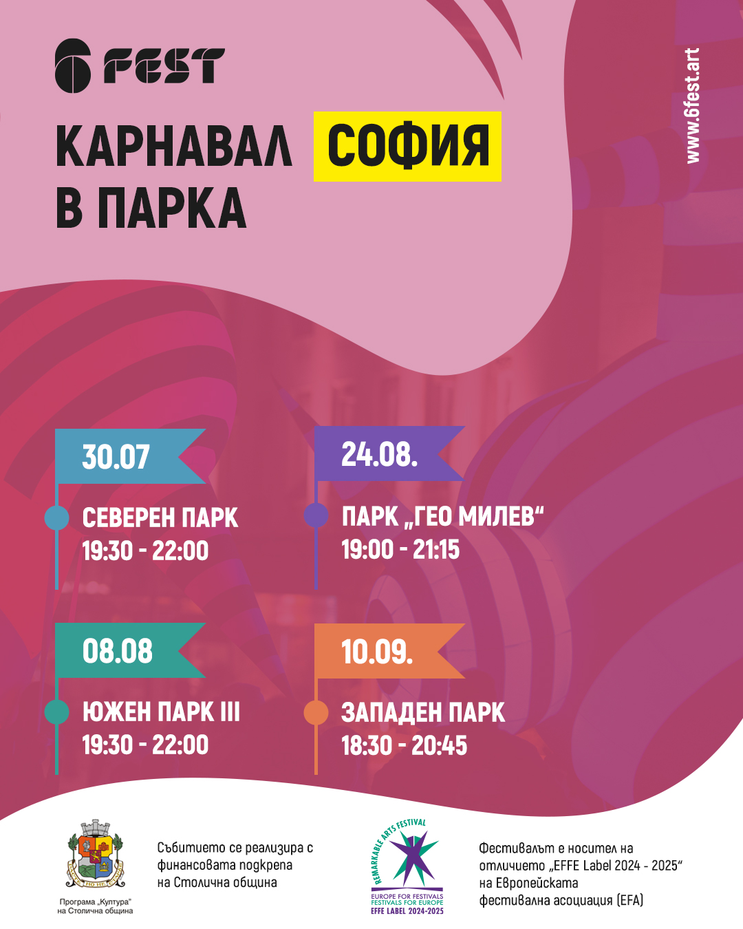 Фестивалът ще представи поредица от карнавални събития в четири софийски парка, реализирани с финансовата подкрепа на Столичната община – Лятна програма в Календара на културните събития. Дневни и светлинни шествия с три от големите карнавални кукли на 6Fest, както и работилници по улични и карнавални изкуства, ще се проведат в Северен парк на 30 юли, в Южен парк на 8 август, в парк "Гео Милев" на 24 август и в Западен парк на 10 септември. Всички събития са с вход свободен.