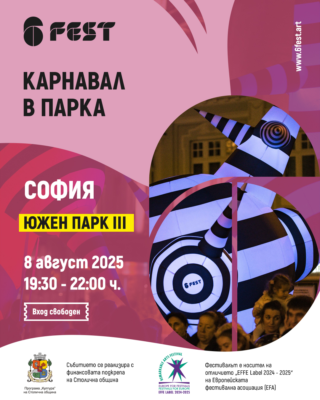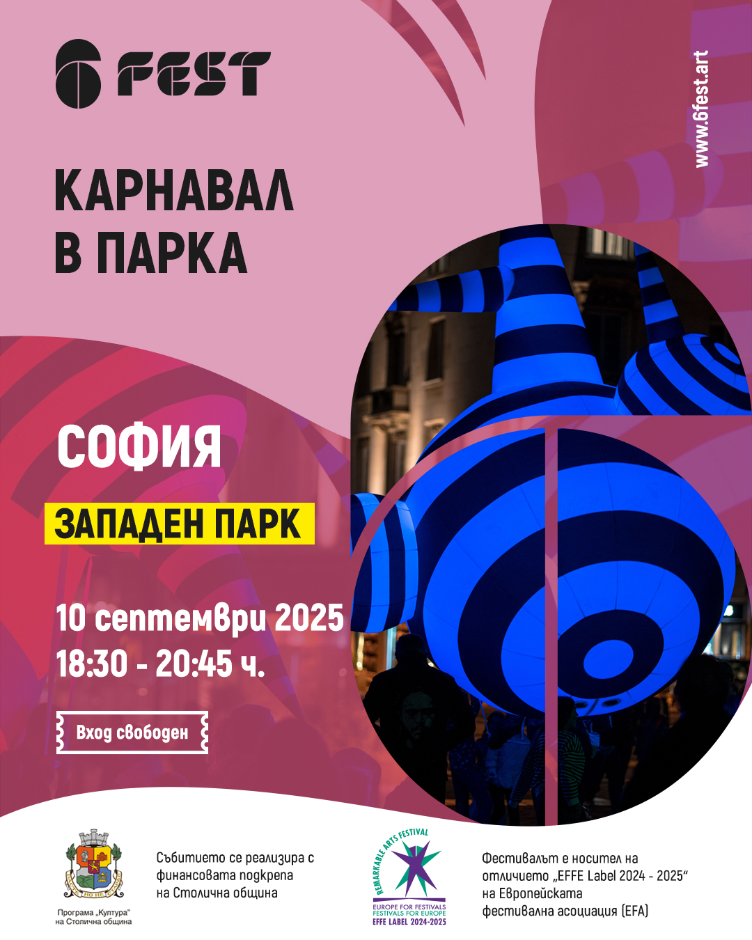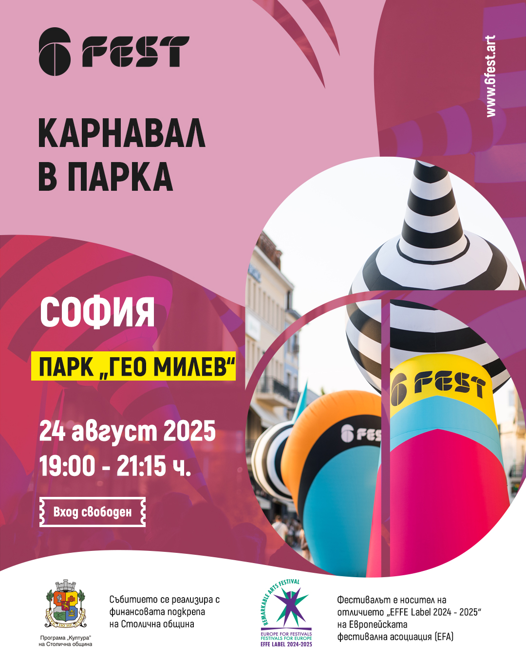 6Fest е първият самостоятелно провеждащ се фестивал в България, посветен на изпълнителските улични изкуства като карнавал, съвременен цирк, куклен театър, живи статуи, огнени изкуства, кокили, улична магия, танц, музика и др. В началото на тази година фестивалът получи отличието EFFE Label 2024 – 2025 на Европейската фестивална асоциация (EFA). Етикетът EFFE се присъжда от международно жури и е европейският знак за качество за забележителни артфестивали, които демонстрират ангажираност към изкуството, участие на местната общност и международна активност. Фестивалът е създаден през 2017 г. и до момента има 16 издания в 10 български града с участието на близо 1000 артисти в над 200 събития.​​​​​​​