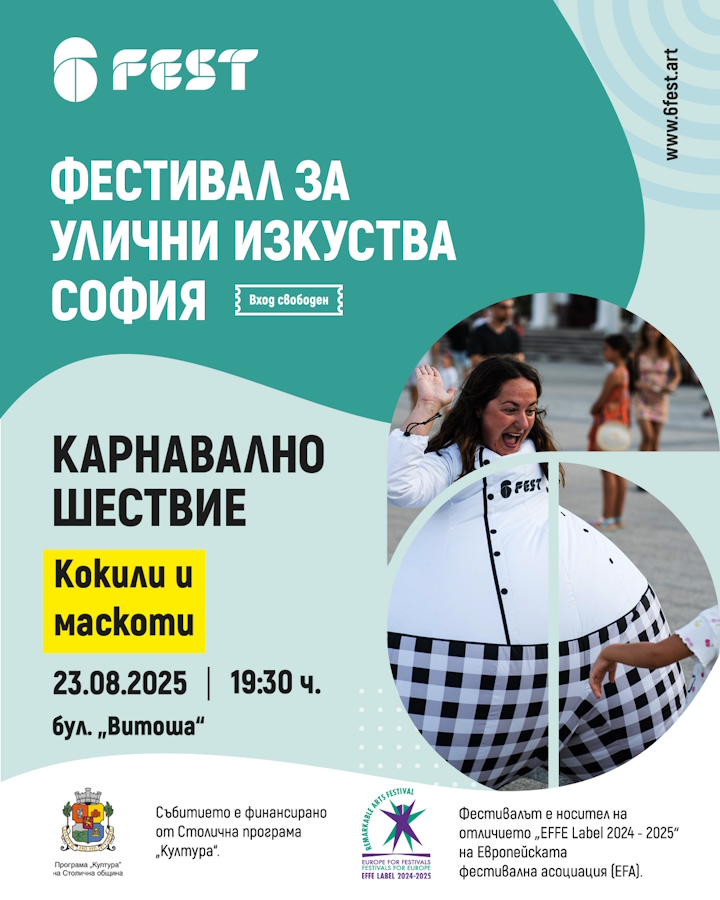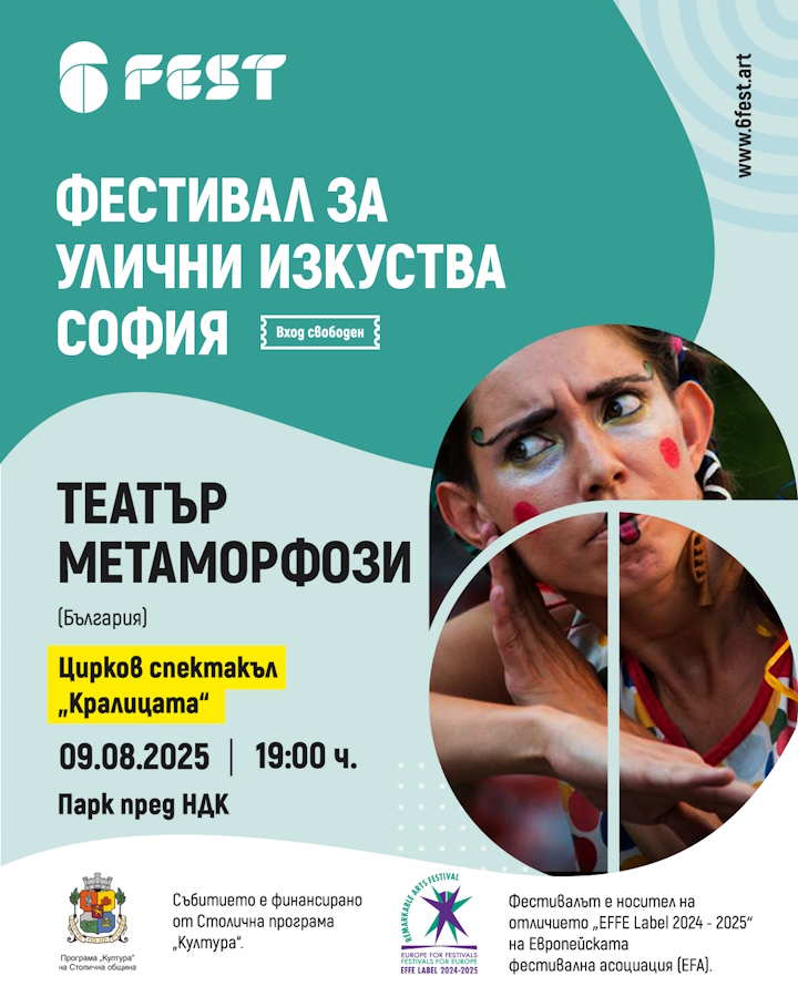 "6Fest София 2025 | Международен фестивал за улични изкуства" кани на първото си голямо самостоятелно международно издание в София, което ще се реализира през август с финансовата подкрепа на Столичната община – Програма "Култура". Входът за всички събития е свободен, те ще се проведат на 9, 21, 22 и 23 август.