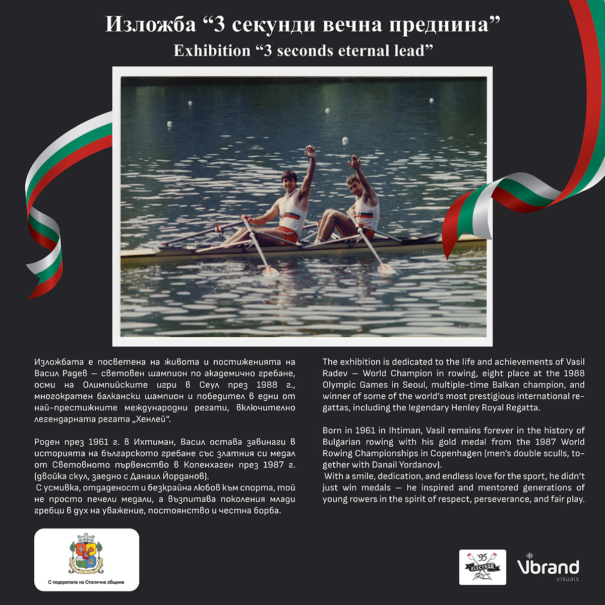 Изложбата е организирана от гребен клуб "Електрон" в партньорство със Столичната община и VBrand Visuals, може да бъде разгледана до 5 август. Тя проследява ключови моменти от спортната кариера и личния път на Васил Радев чрез фотографии, архивни материали и спомени на негови съотборници, треньори и близки. Подбрани кадри разказват историята на човек, който не само печели медали, но и възпитава поколения гребци с ценности като постоянство, уважение и отдаденост.
