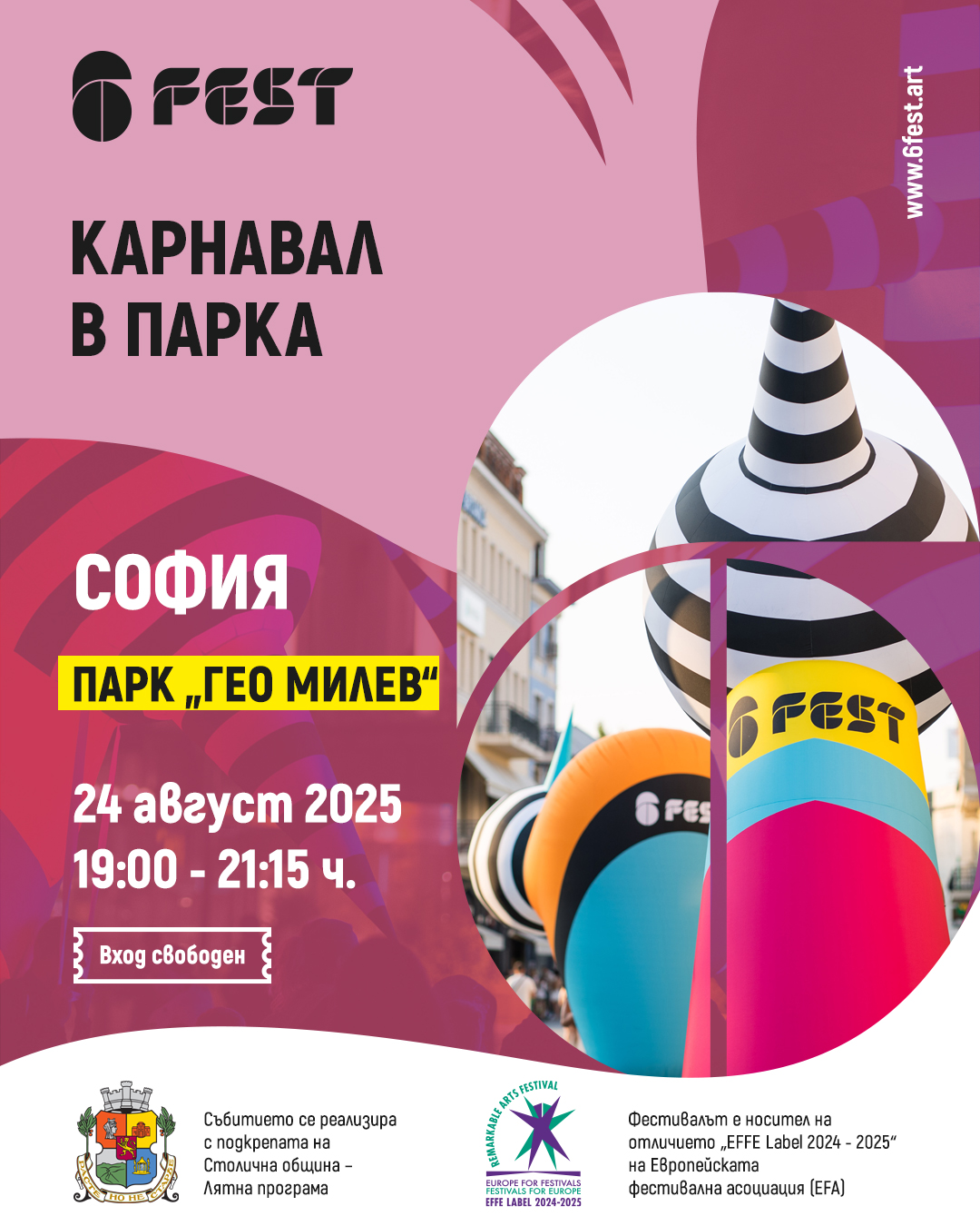 Карнавални шествия и куклен театър ще гледат софиянци и гостите на столицата в следващите събития от Международния фестивал за улични изкуства 6Fest (ШестФест) от 21 до 24 август. Всички събития са с вход свободен и се осъществяват с подкрепата на Столична община по Столична програма „Култура“ и Лятната програма на Календара на културните събития на Столична община за 2025 г.
