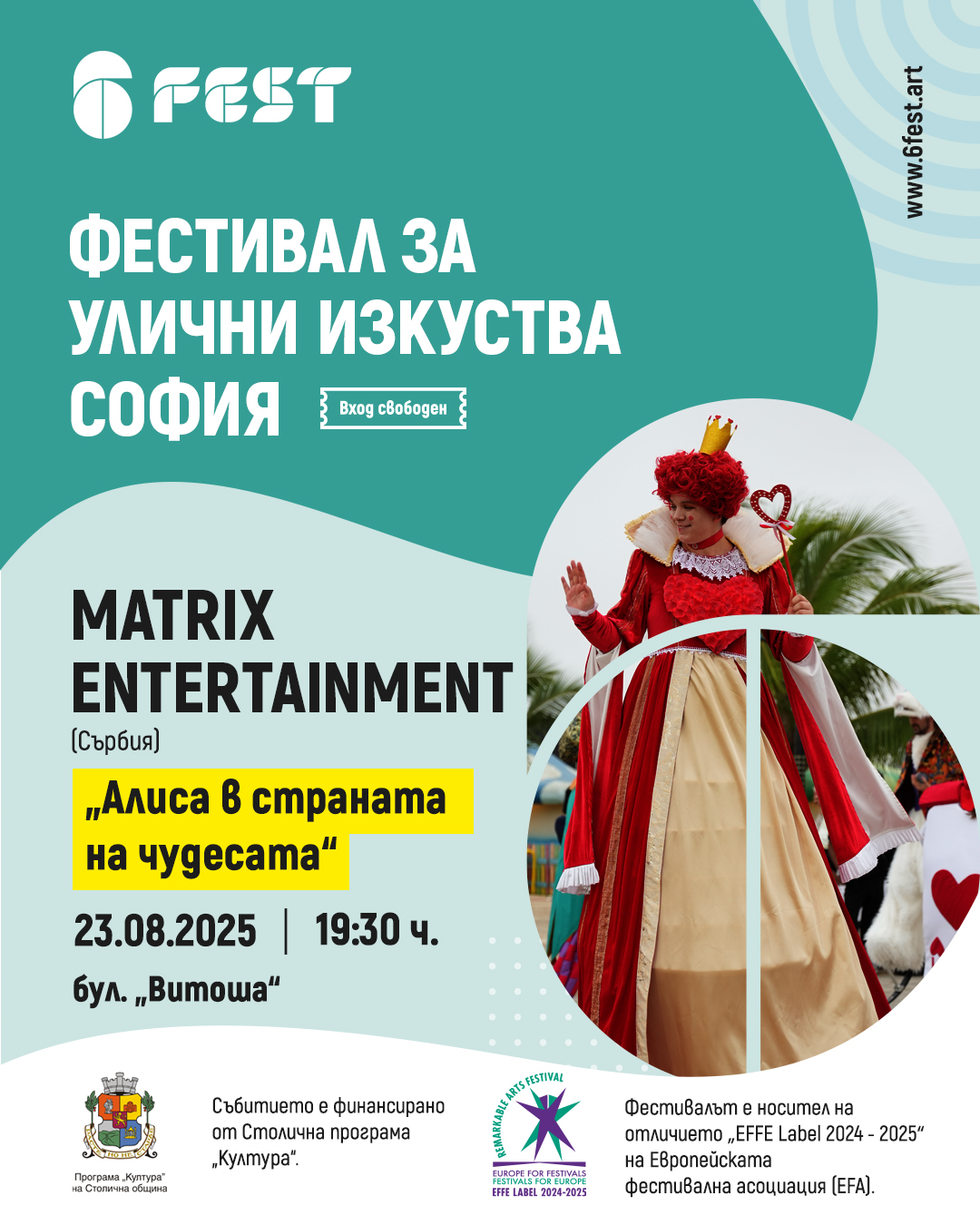 Второто карнавално шествие от пPрограмата на 6Fest е на 23 август от 19:30 ч. в пешеходната зона на бул. „Витоша“. От пресечката с ул. „Алабин“ в посока бул. „Патриарх Евтимий“ ще видим артисти на кокили и в маскоти като 5 от причудливите герои на Луис Карол от „Алиса в страната на чудесата“ – Алиса, Белия заек, Шапкаря, Картата и Царицата. В събитието ще участва „Matrix Entertainment“ – цирково-театрална формация от Нови Сад, Сърбия.