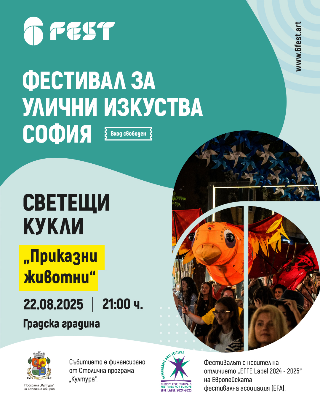 ● 21:00 – 22:00 ч. Шествие на светещите карнавални кукли „Приказни животни“ на 6Fest