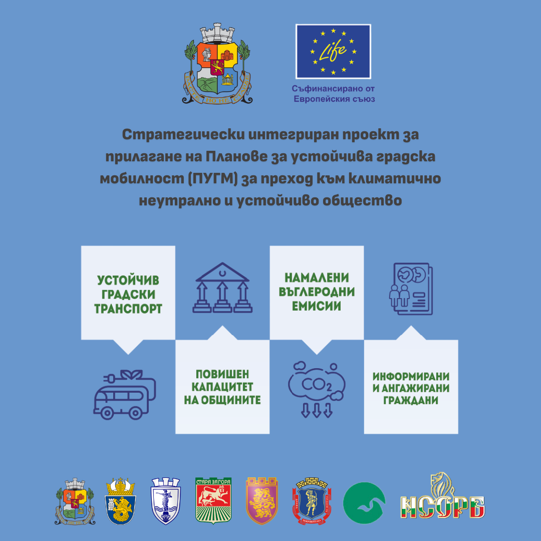 Водещ партньор е Столична община в партньорство с общините Бургас, Русе, Стара Загора, Велико Търново и Монтана, Националното сдружение на общините в Република България (НСОРБ) и Клуб „Икономика 2000“. Основната цел на проекта е да подпомогне общините в реализирането на Плановете за устойчива градска мобилност (ПУГМ) като ключов инструмент за постигане на климатична неутралност и устойчивост спрямо климатичните промени. Проекта стартира в началото на 2024 г. и ще се изпълнява в три фази които обхващат период с хоризонт 2030 г. Към момента проекта е в изпълнение на Фаза 2.