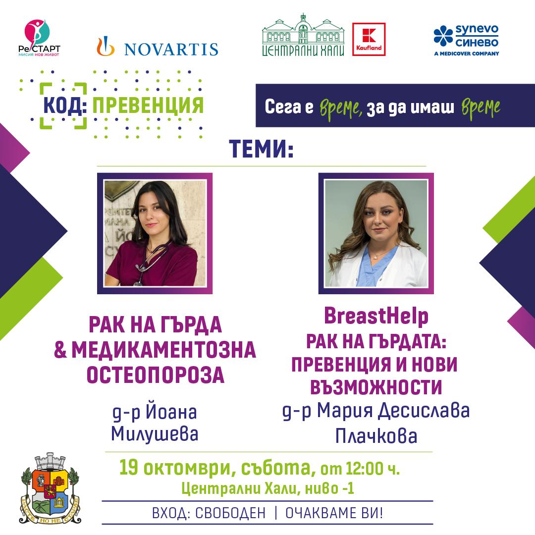 Кампанията „КОД: Превенция – Сега е време, за да имаш време“ продължава с второто си събитие с вход свободен на 19 октомври от 12:00 ч. в Централни хали, София. Този месец изданието е посветено на превенцията и ранната диагностика на рака на гърдата – най-разпространените онкологични заболявания сред жените в България, а гостите ще получат възможност за безплатен преглед и ваучер за безплатни изследвания. Активностите са част от кампанията „КОД: Превенция – Сега е време, за да имаш време“, организирана от Столична община и Фондация "РеСтарт" в партньорство с Медицински лаборатории "Синево България", Kaufland България и Novartis България.