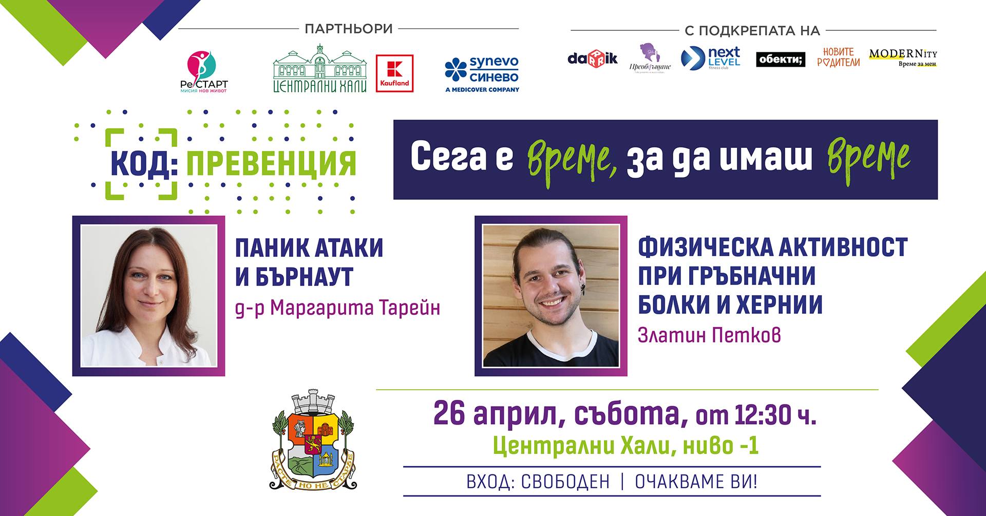 В съботата след Великден – на 26 април от 12:30 ч. в Централни хали – те очакваме с ново издание на „КОД: Превенция – Сега е време, за да имаш време“. Темите този месец са посветени на едни от най-честите предизвикателства пред съвременния човек – паник атаки, бърнаут и болките в гърба.
