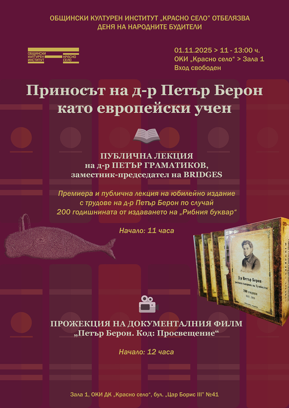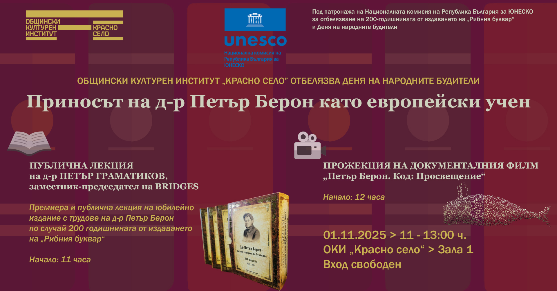 Заповядайте на 1 ноември в Зала 1 на Общински културен институт „Красно село“, за да отбележим заедно 200-годишнината от „Рибния буквар“ и да открием наново делото на един от най-големите българи на XIX век – д-р Петър Берон.